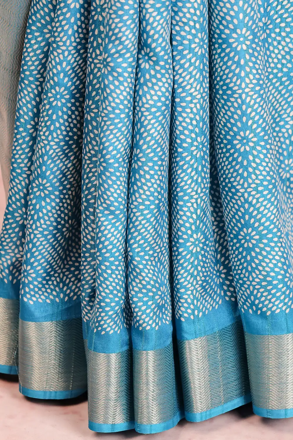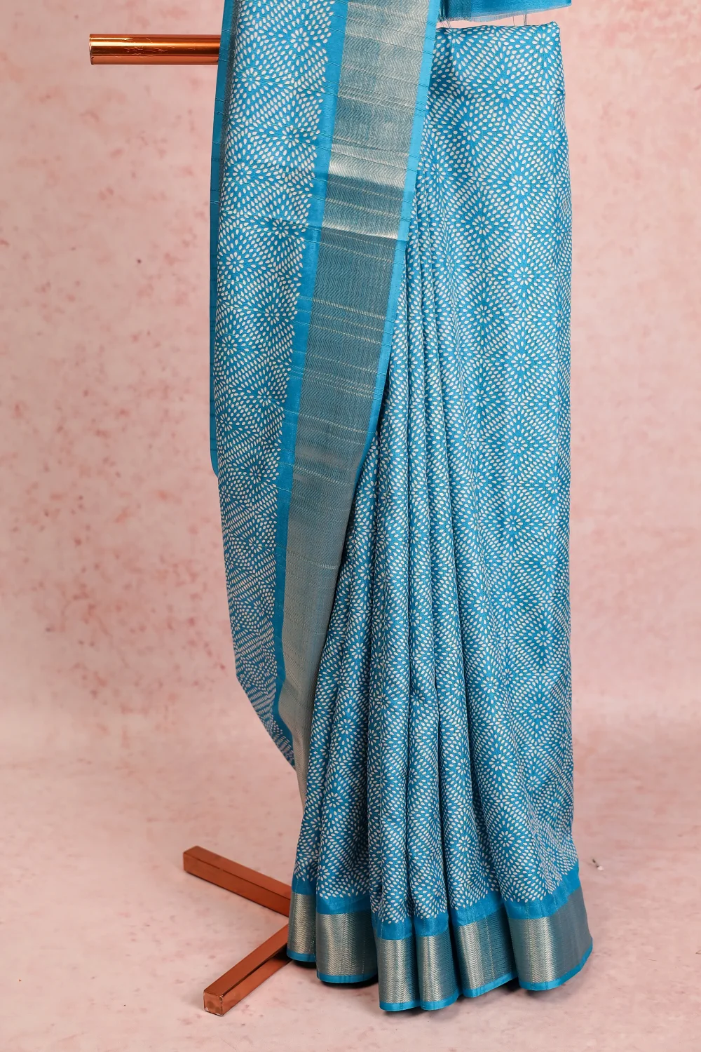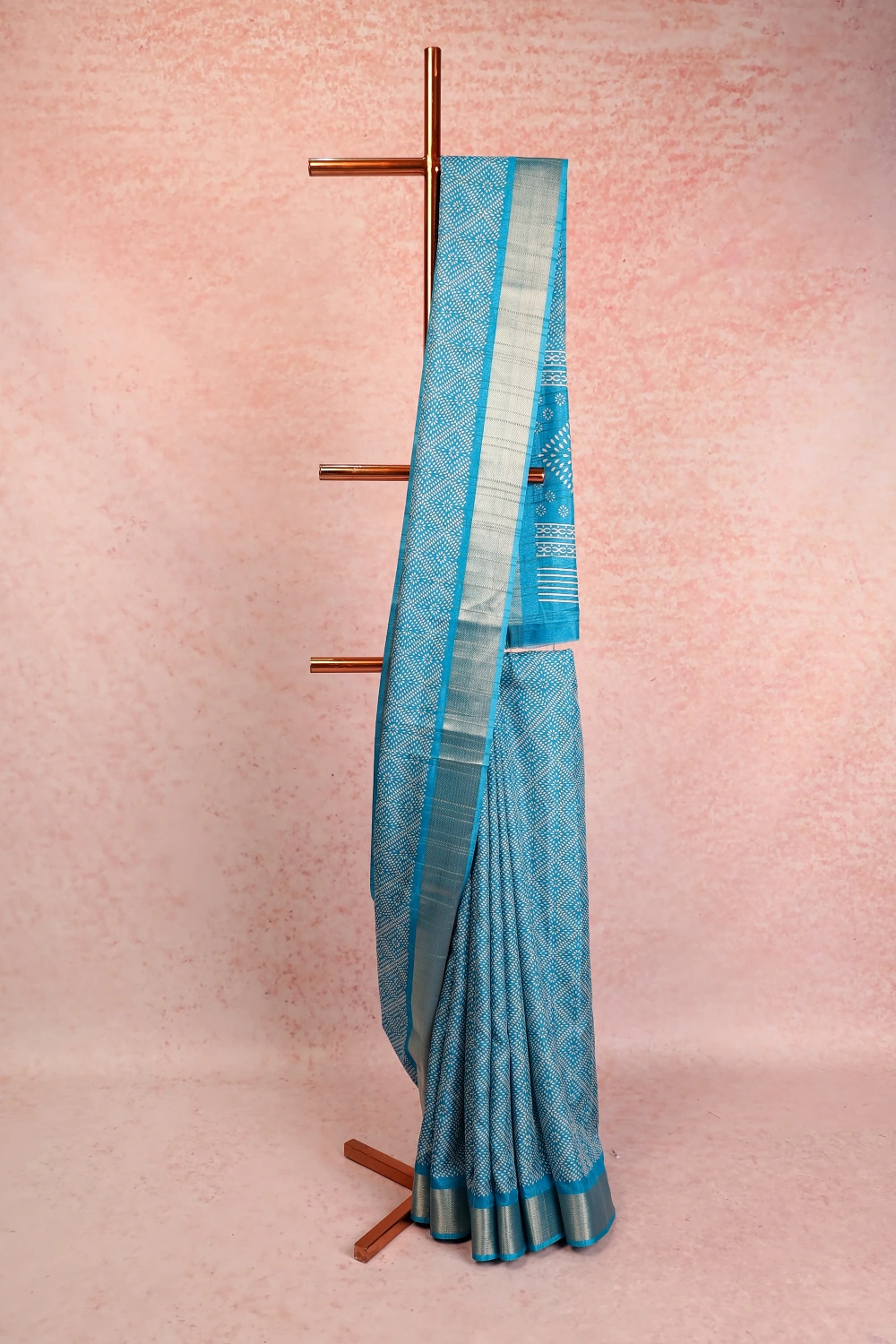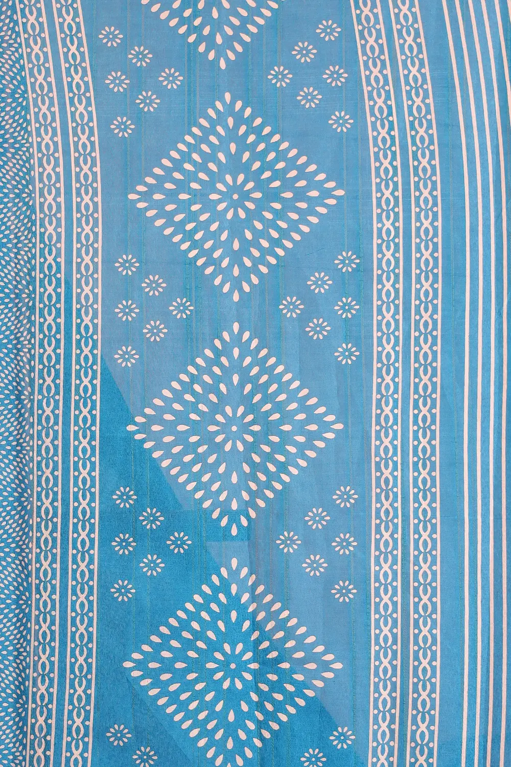 Sky Blue Semi Tussar Printed Saree with Designer Border. Includes Unstitched Blouse