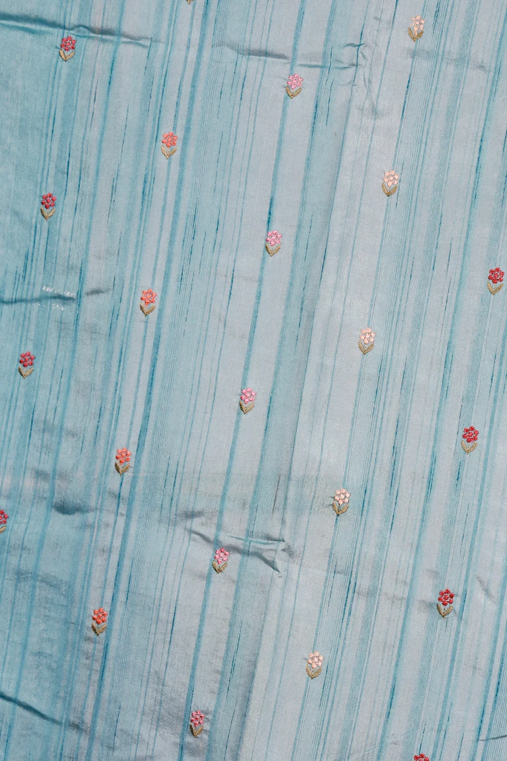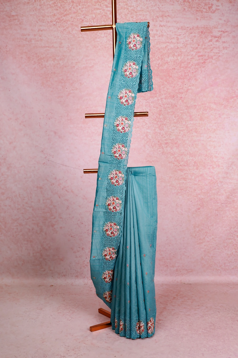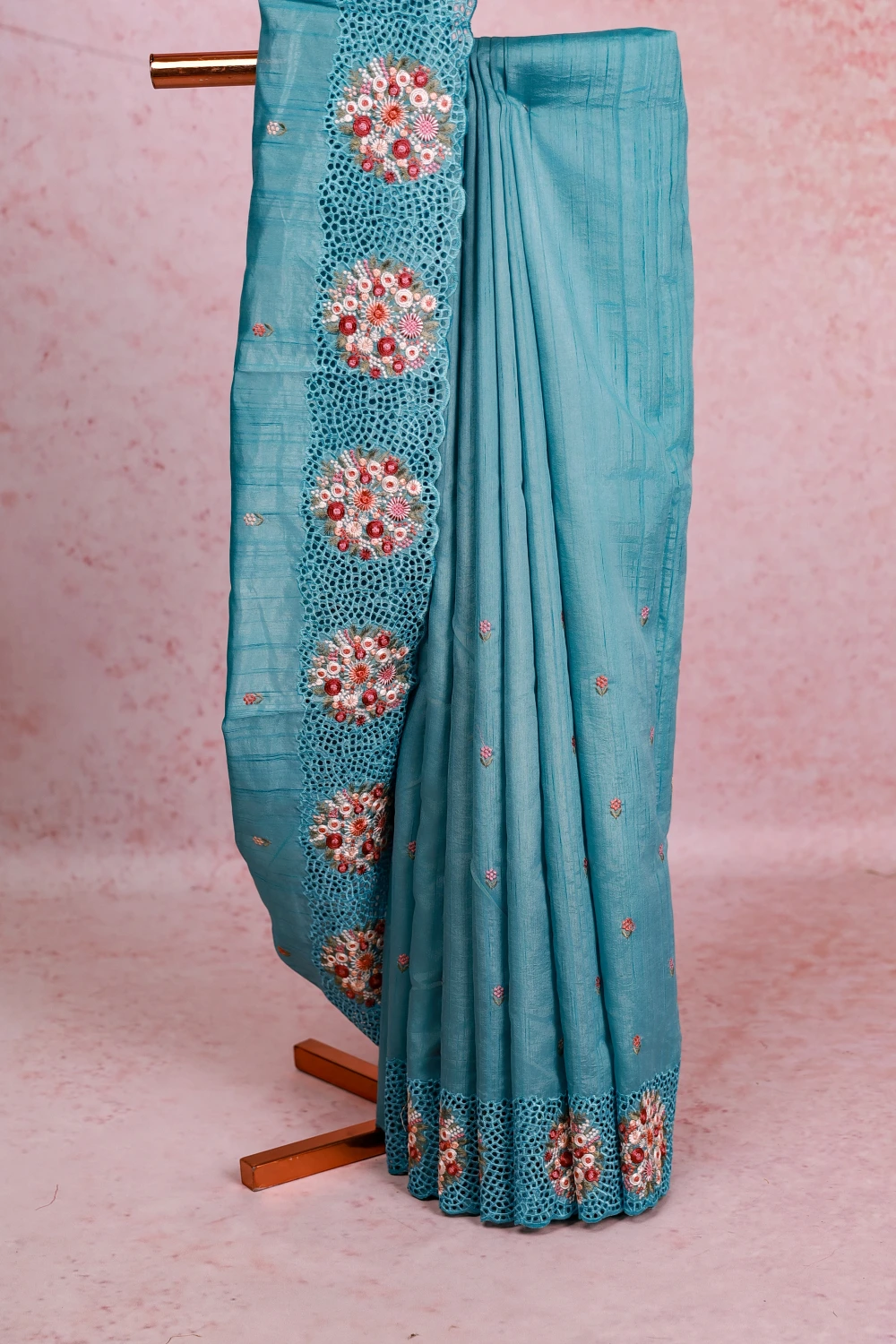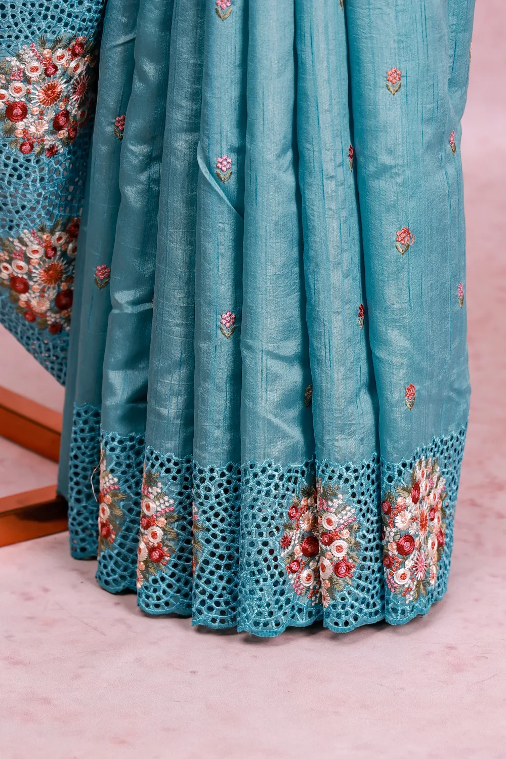 Sky Blue Semi Tussar Embroidary And Cutt Work Saree With Cut Work Border. Includes Un Stitched Blouse