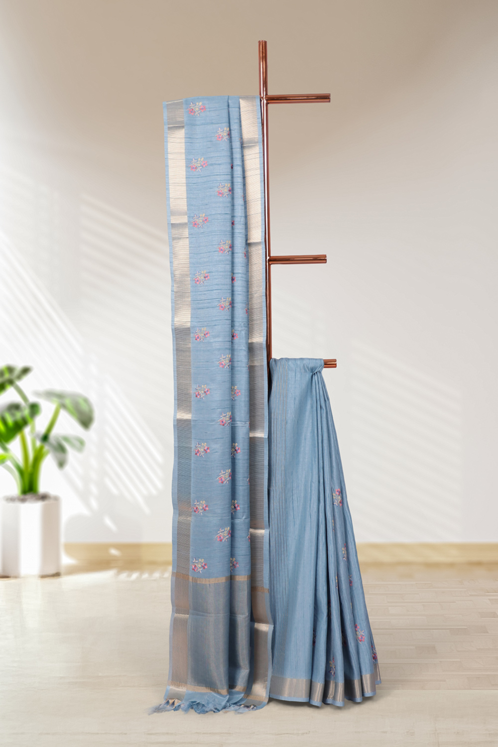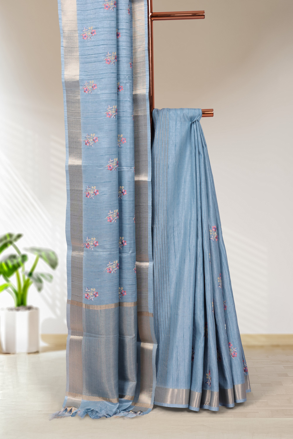 Sky Blue Semi Tussar Butta Saree with Golden border. Includes Unstitched Blouse