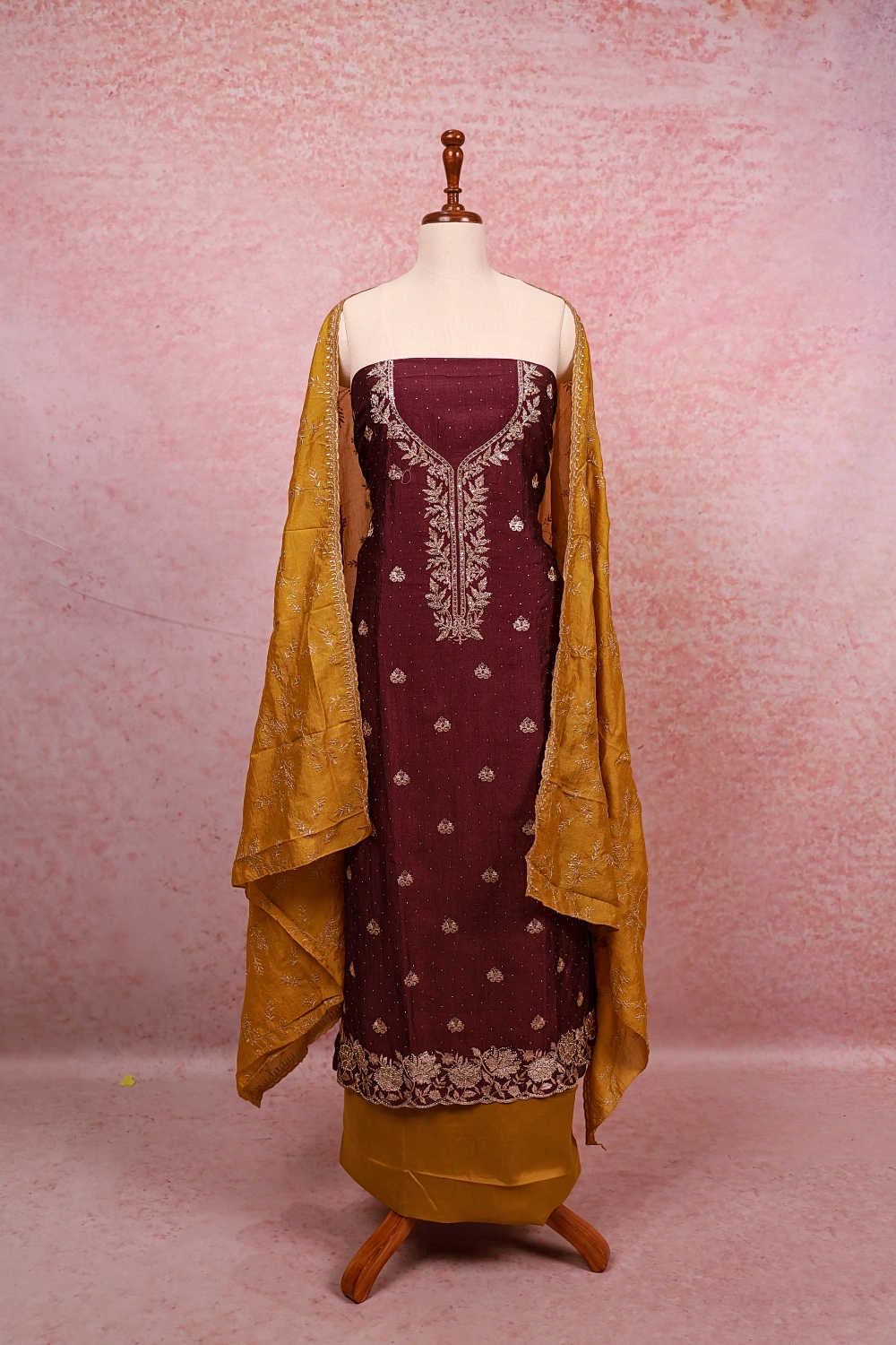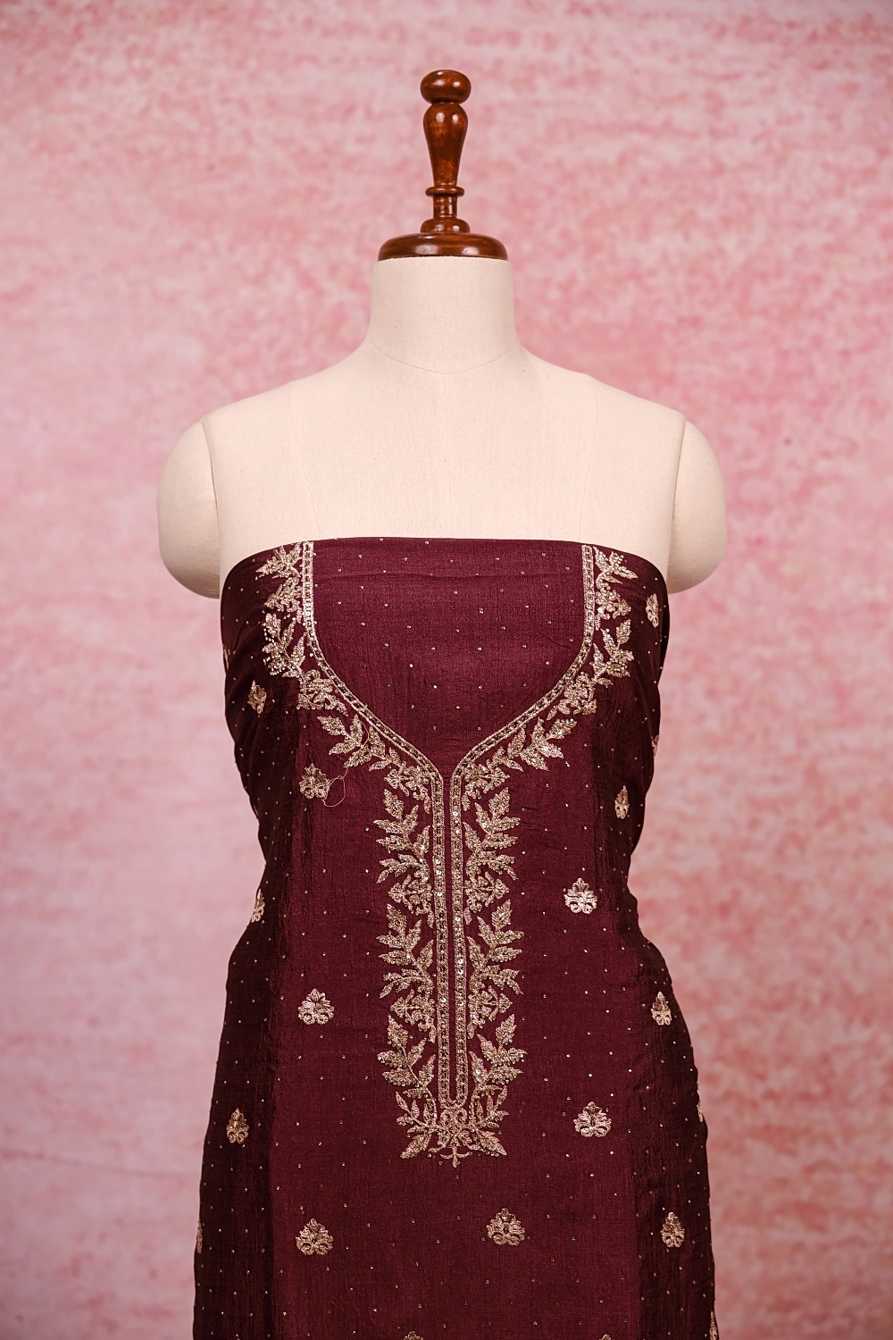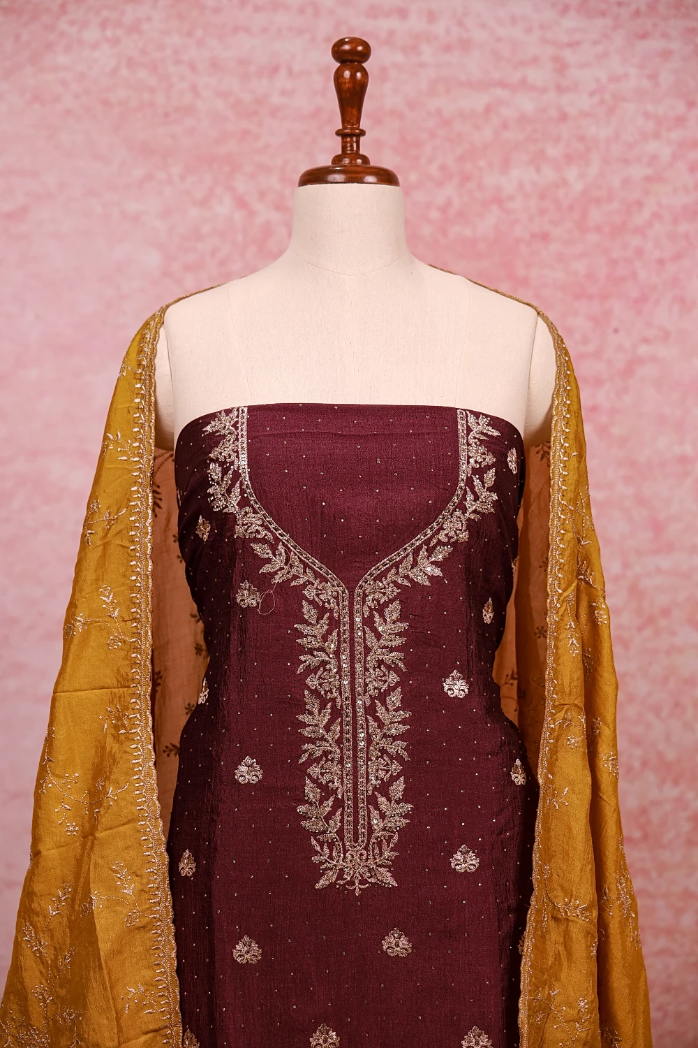 Sparkling Grape Vichitra Silk Thread And Stone Work Unstitched Churidar Material. Includes Dupatta.
