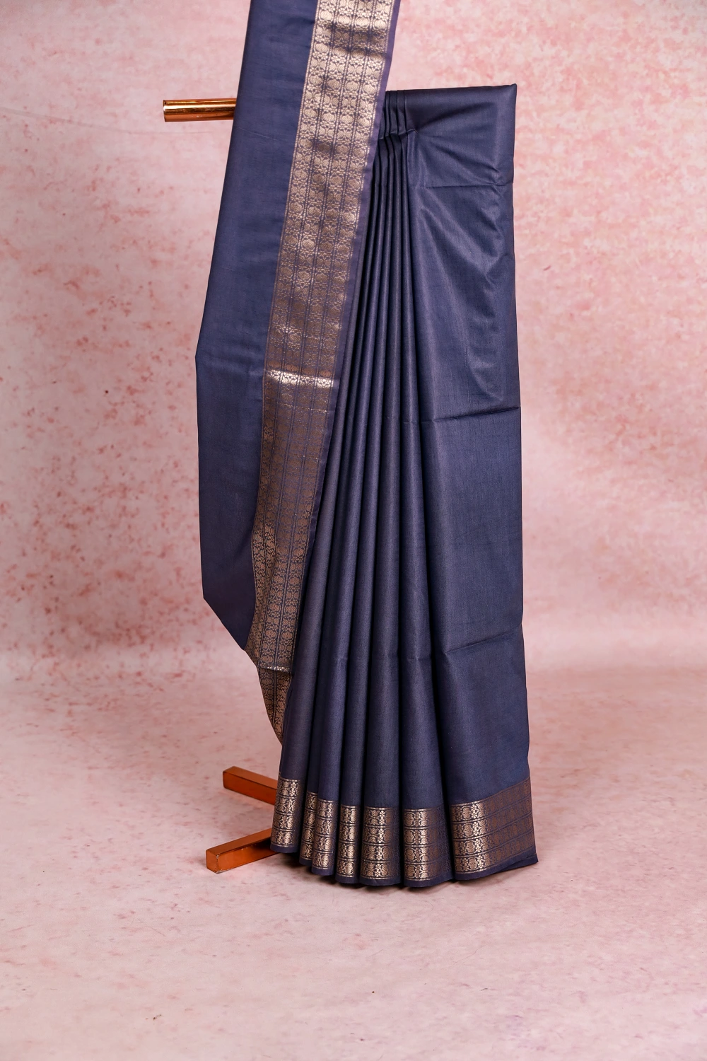 Steel Blue Semi Tussar Plain Body Saree with Zari Border. Includes Unstitched Blouse