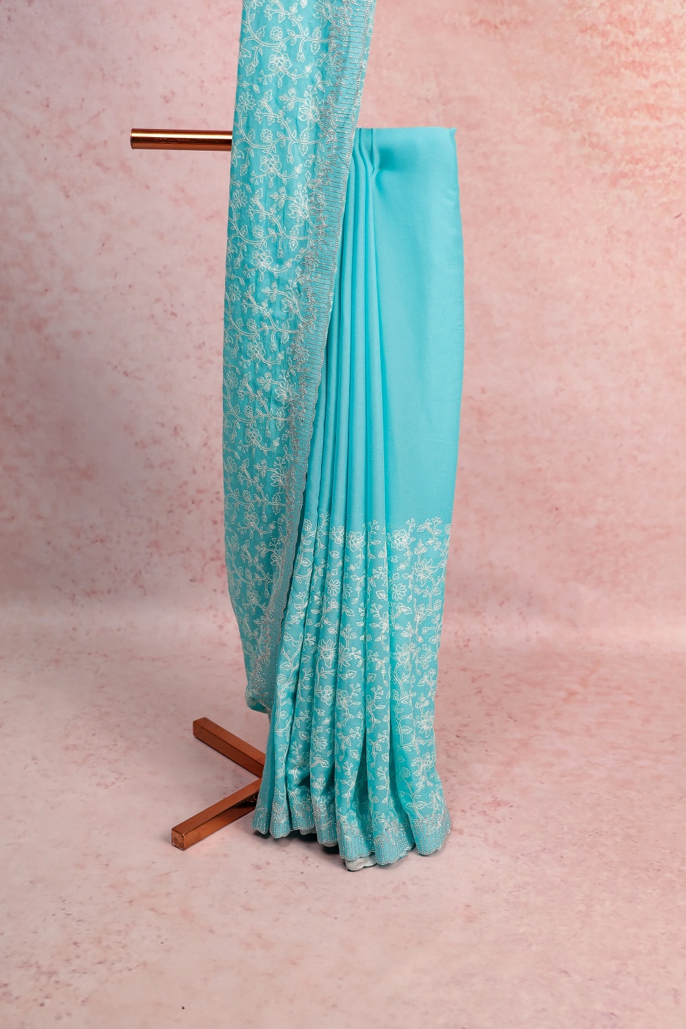 Turquoise Green Georgette Embroidery Saree with Scalp Border. Includes Un stitched Blouse