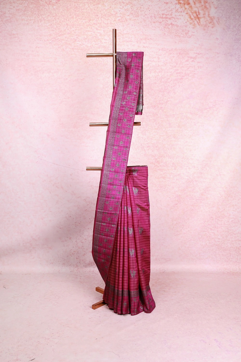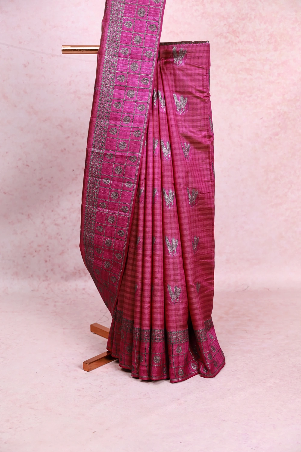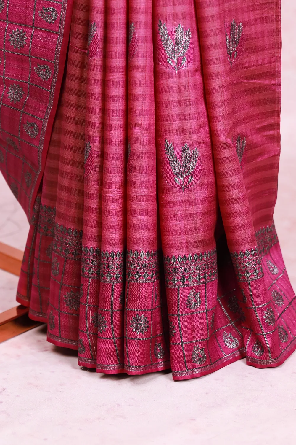 Violet Semi Jute Brocade Saree with Check Border. Includes Unstitched Blouse