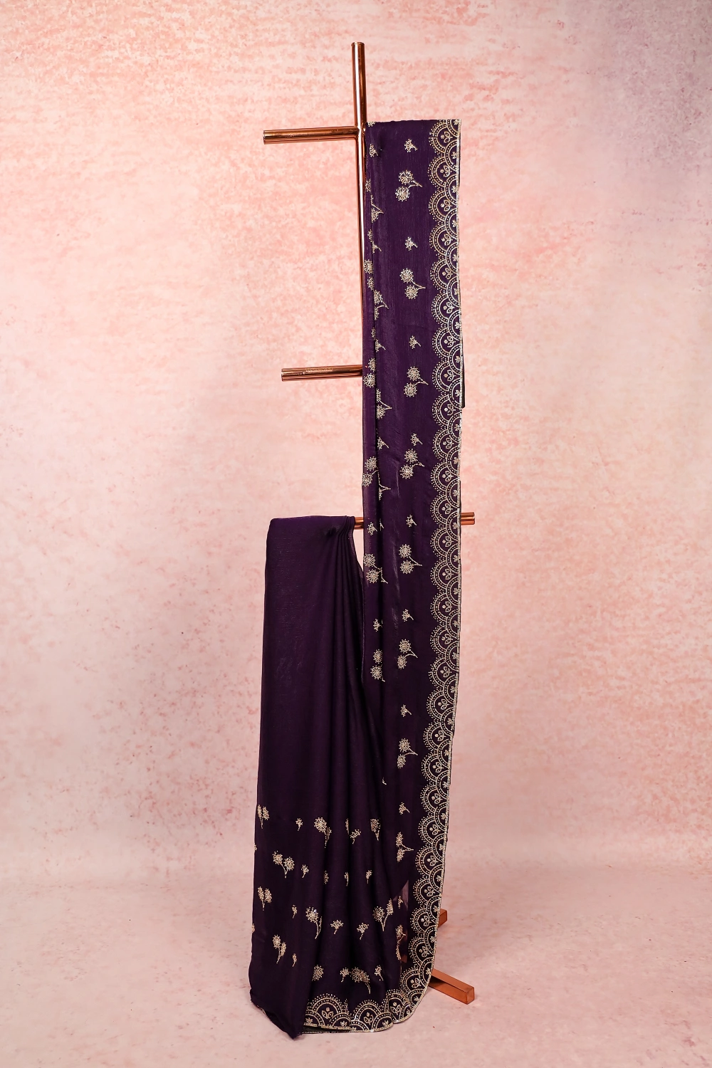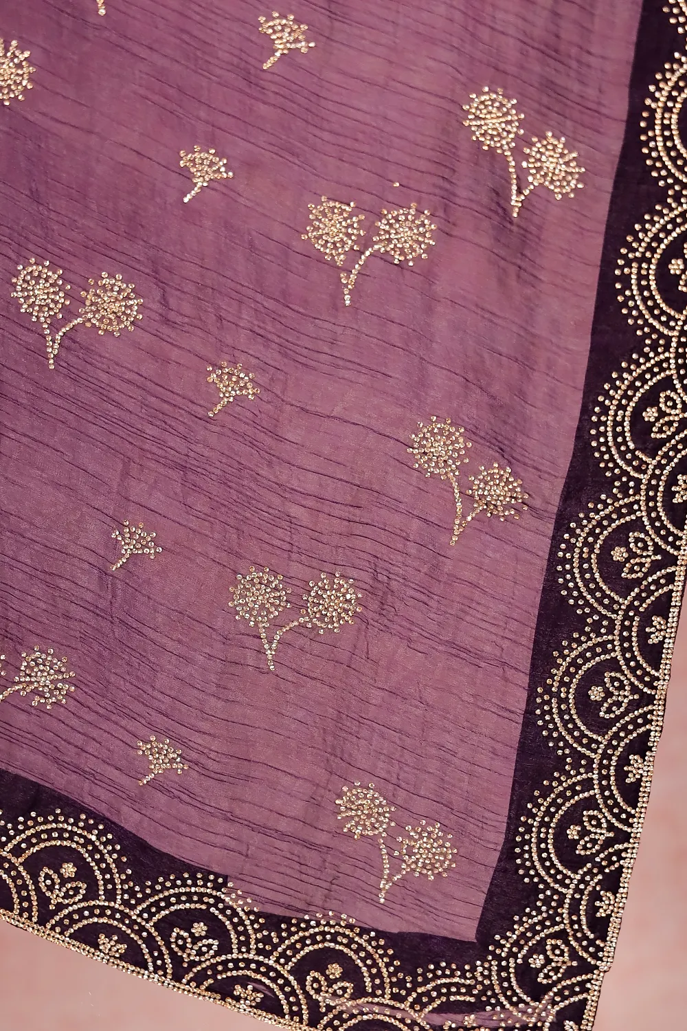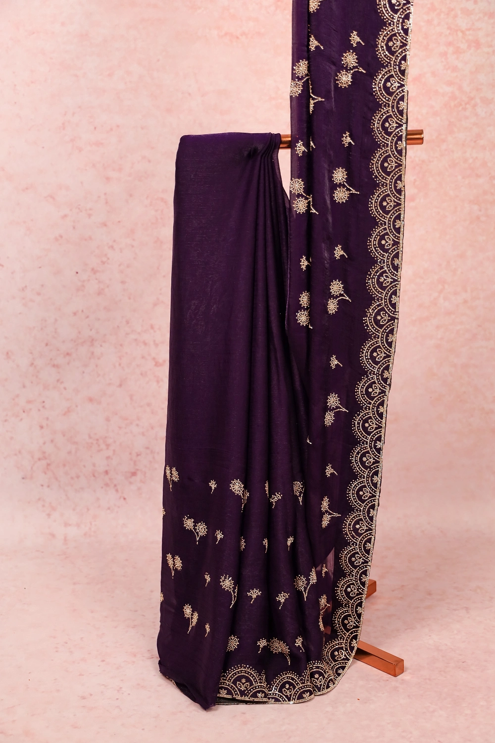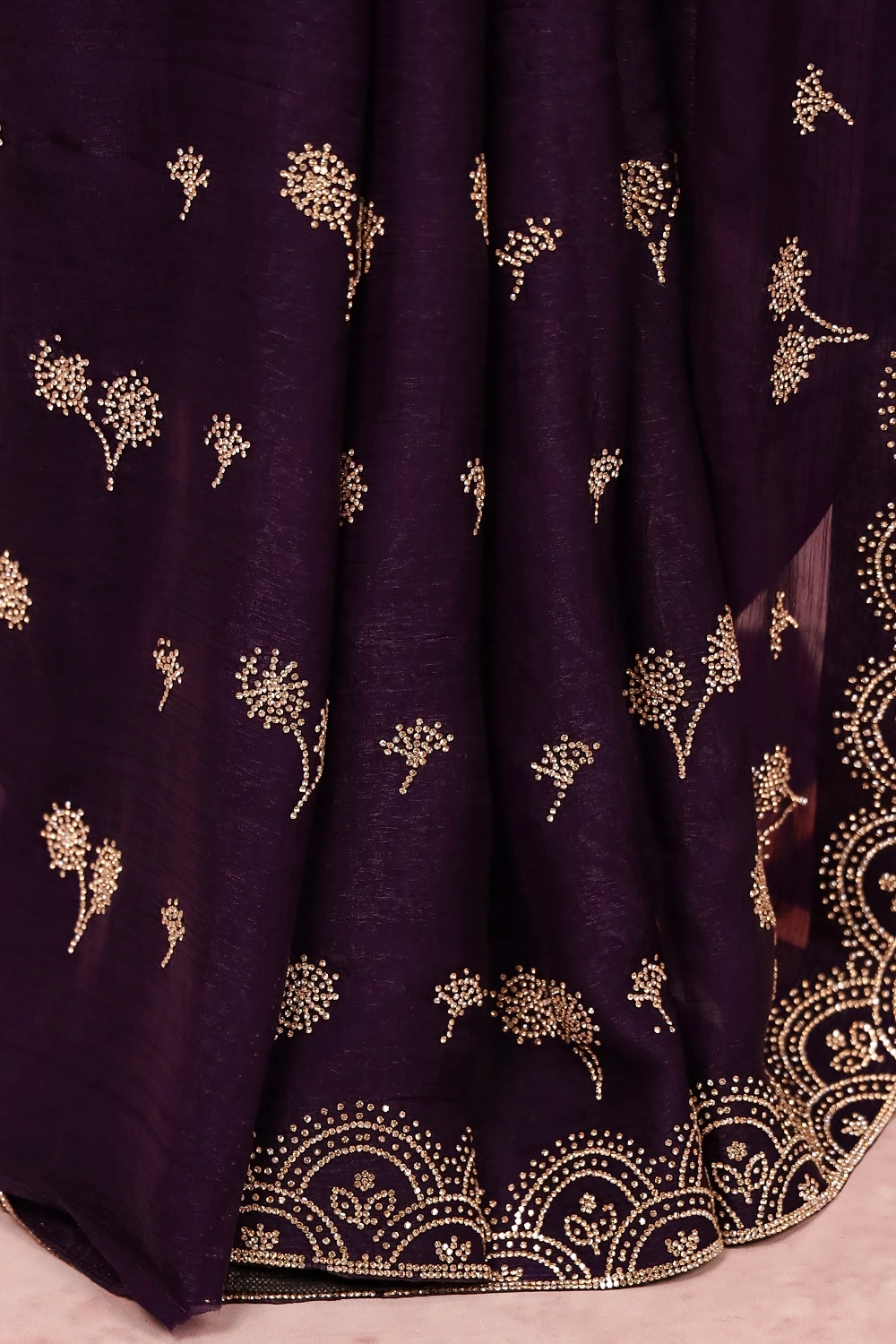 Violet Velvet Organza Stone Work Saree with Stone Border. Includes Unstitched Blouse