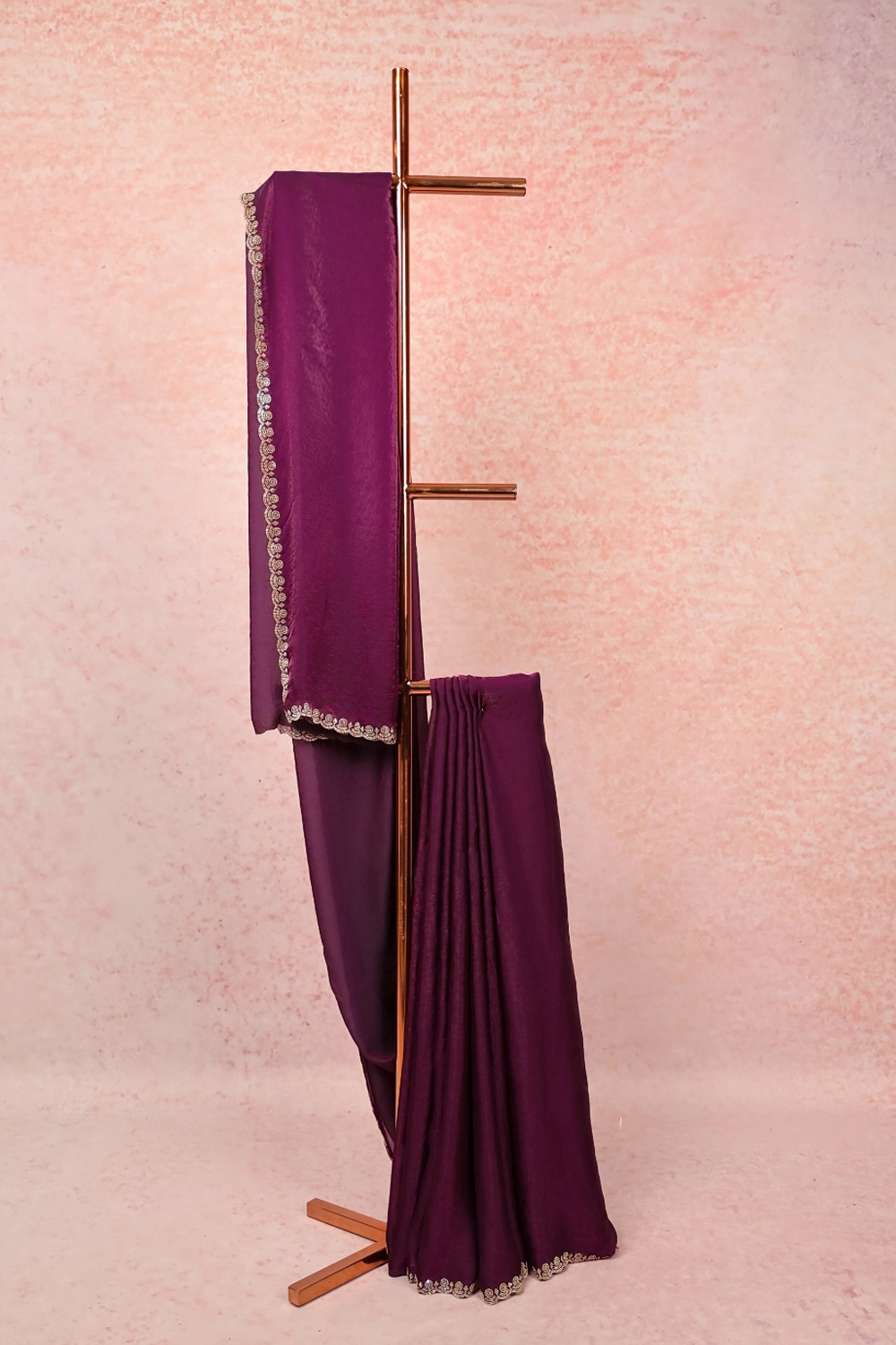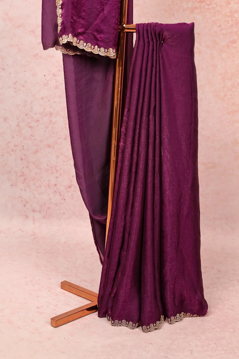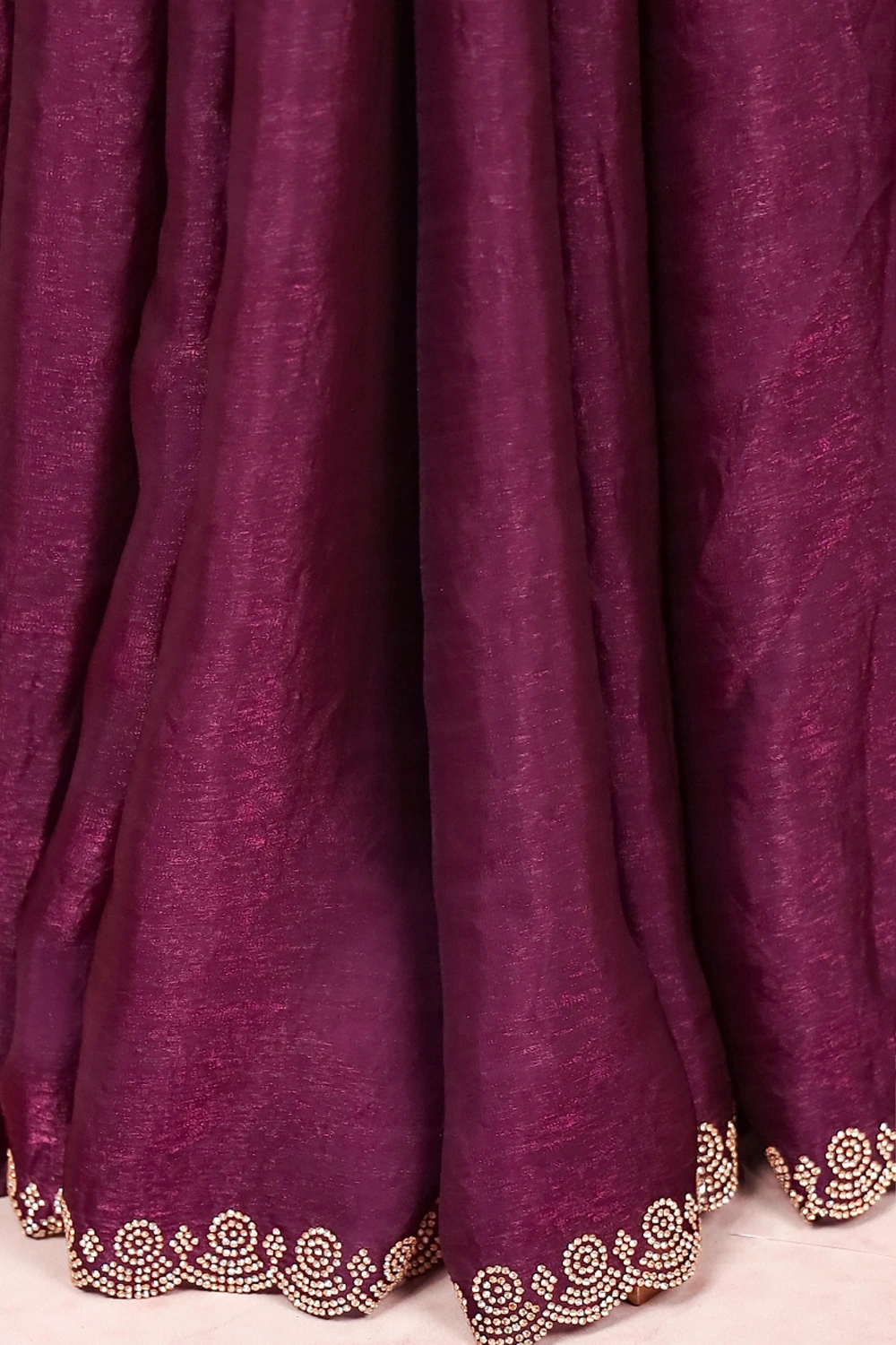 Violet Velvet Organza Plain Body Saree with Stone Border. Includes Unstitched Blouse