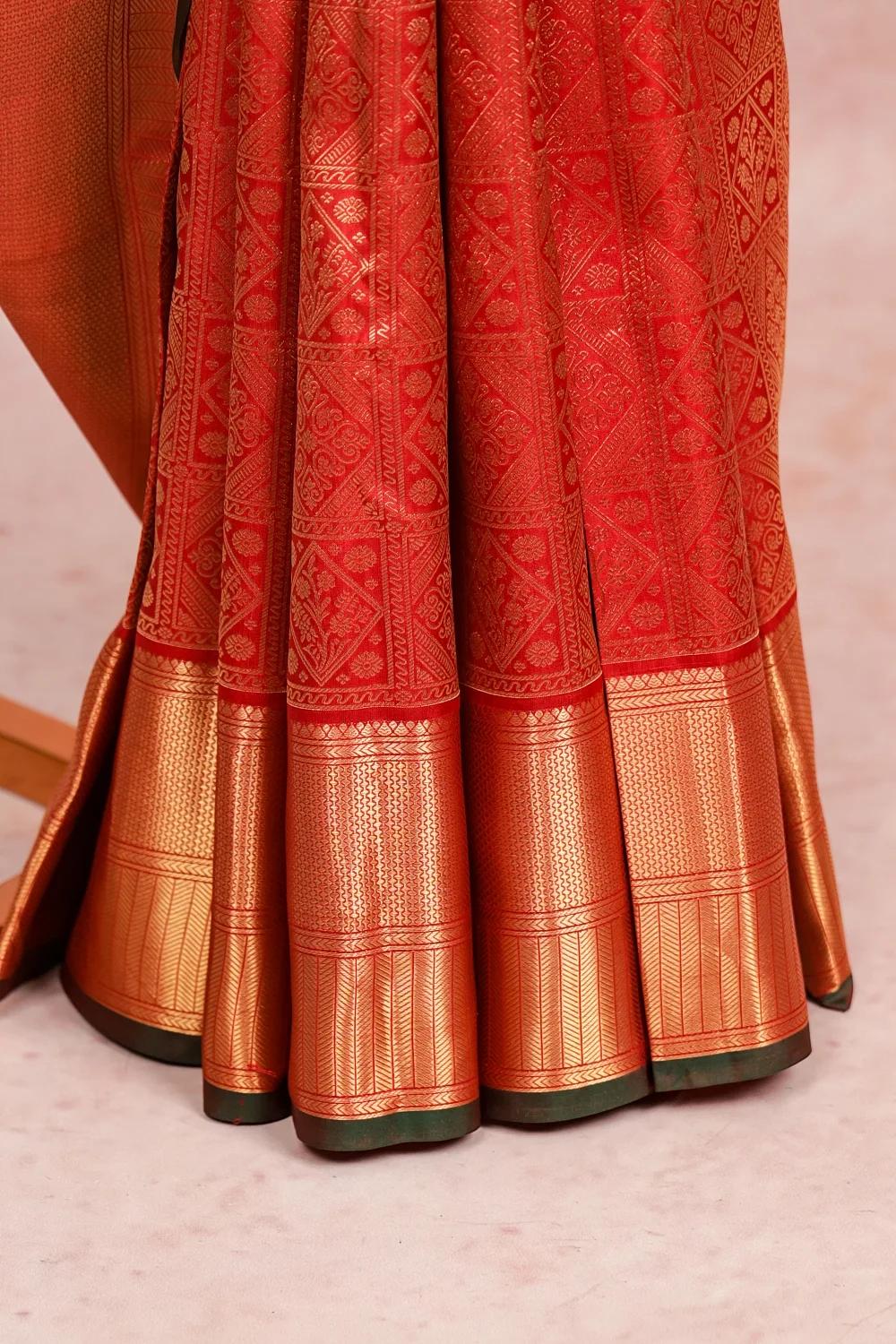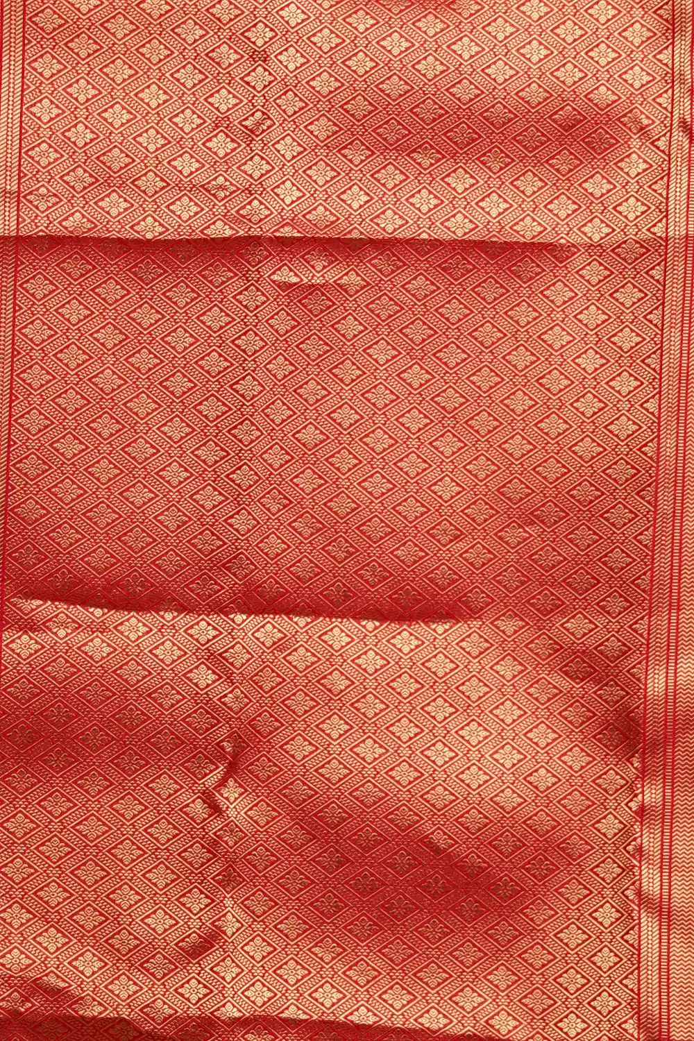 Wax Red Kancheepuram Banarasi Design Saree with Bavanji Border. Includes Unstitched Blouse