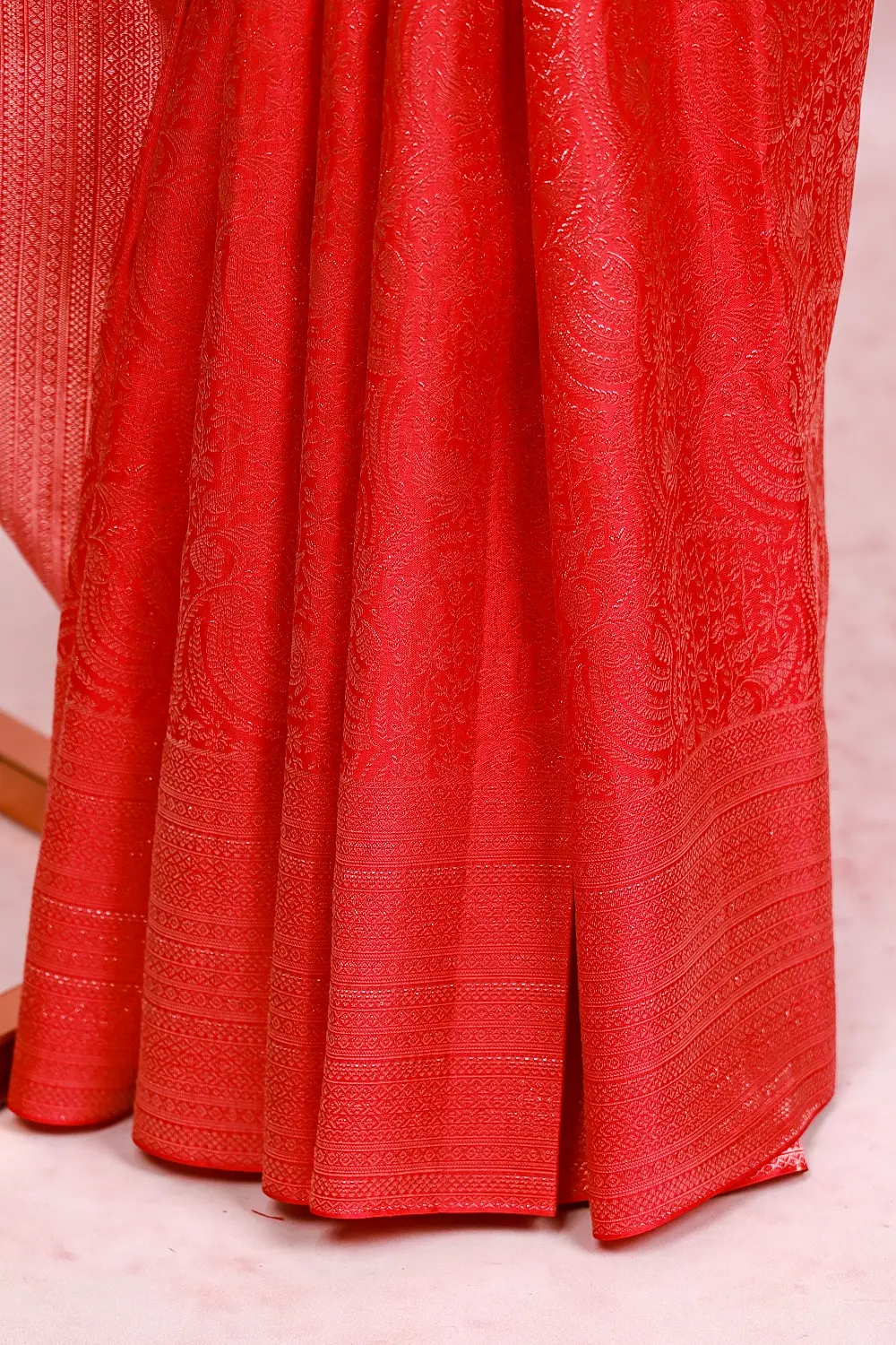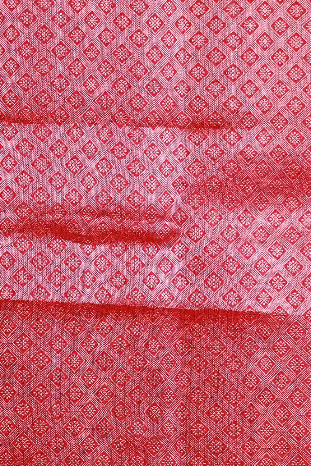 Wax Red Kancheepuram Silk Banarasi Design Saree With Banarasi Antique Border. Includes Unstitched Blouse