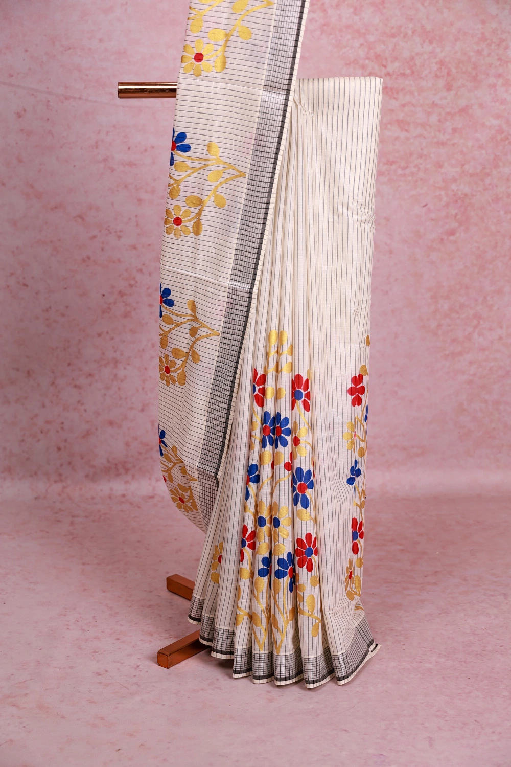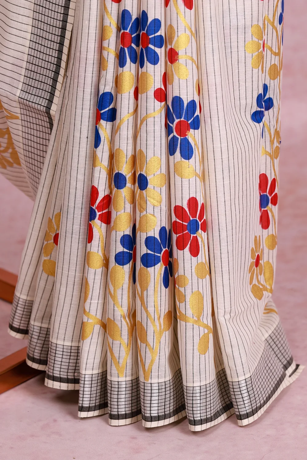 White Cotton Kerala Stripes With Floral Design Saree With Check Border. Includes Un Stitched Blouse