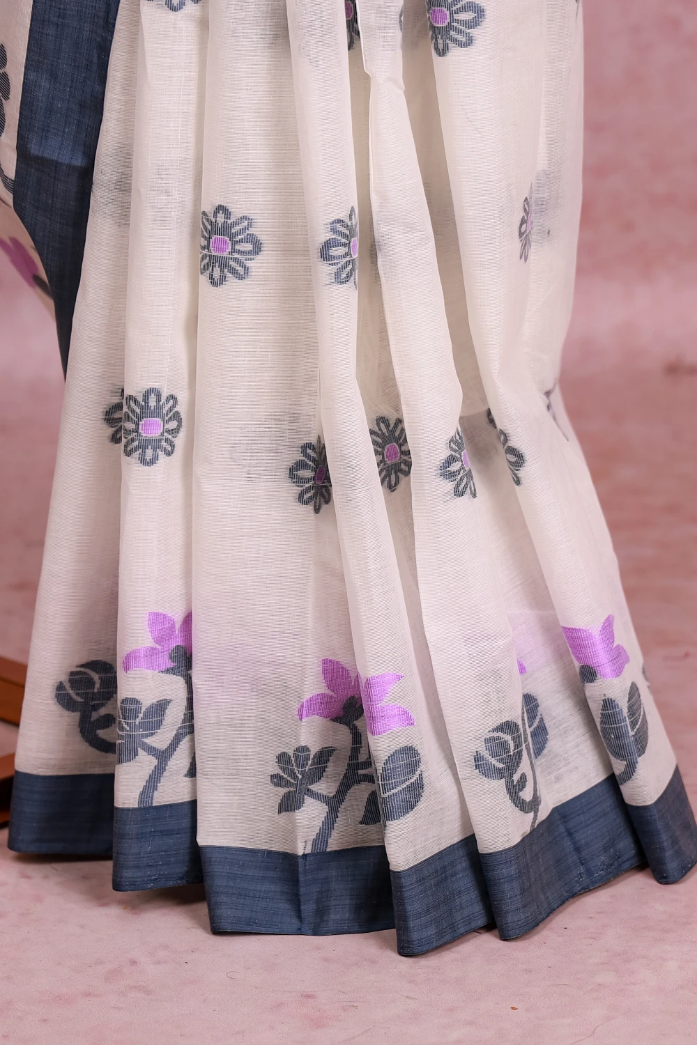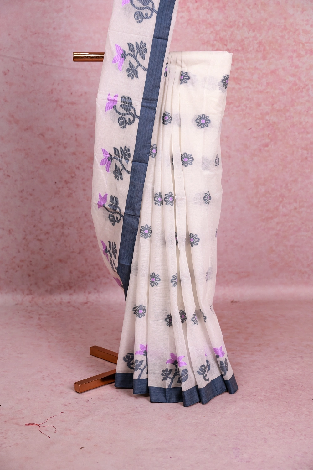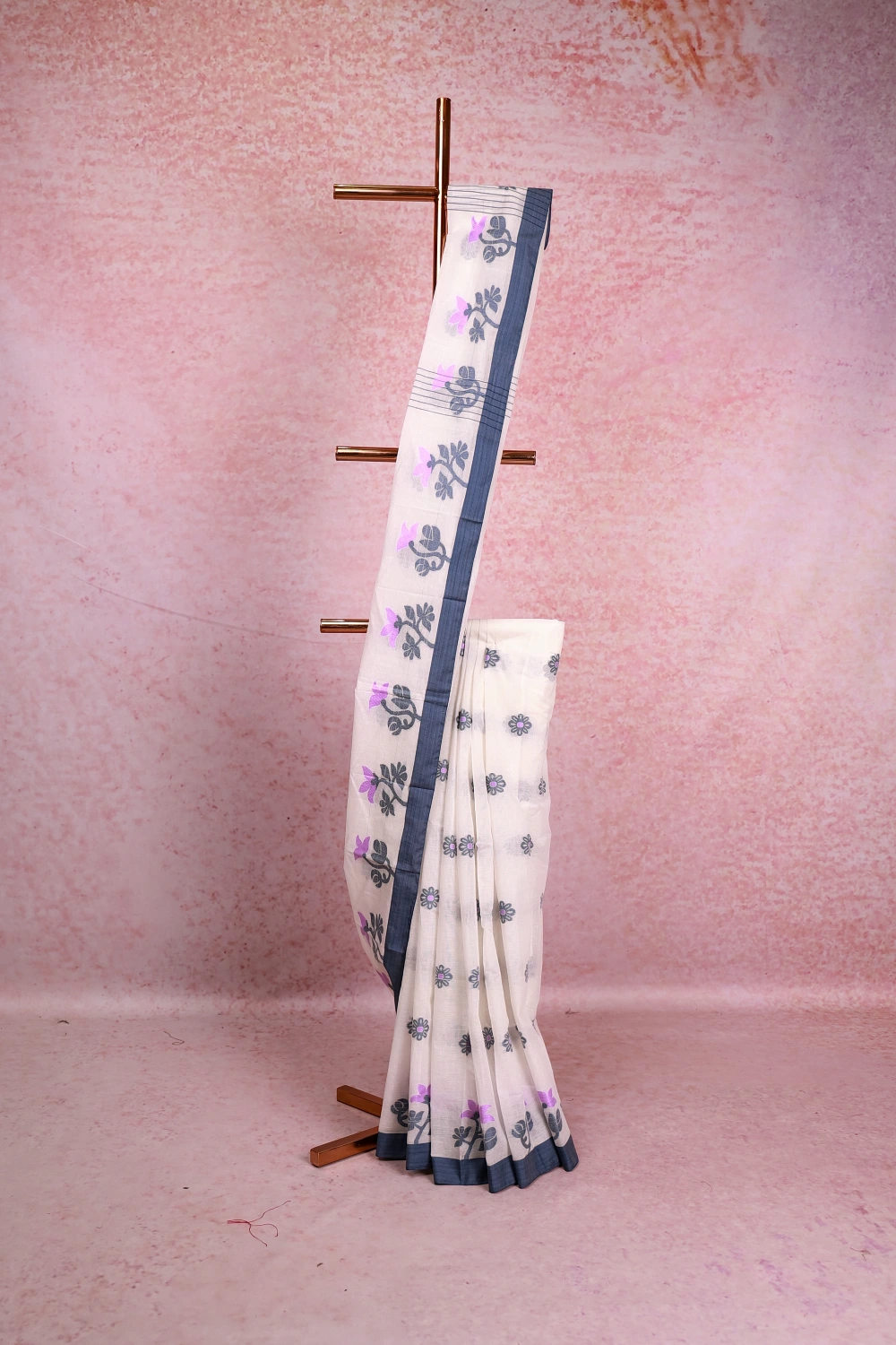 White Cotton Floral Design Saree With Contrast Colour Border. Includes Un Stitched Blouse
