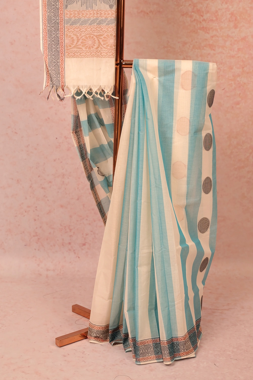 White Cotton Stripes With Butta Saree with Designer border. Includes Un Stitched Blouse