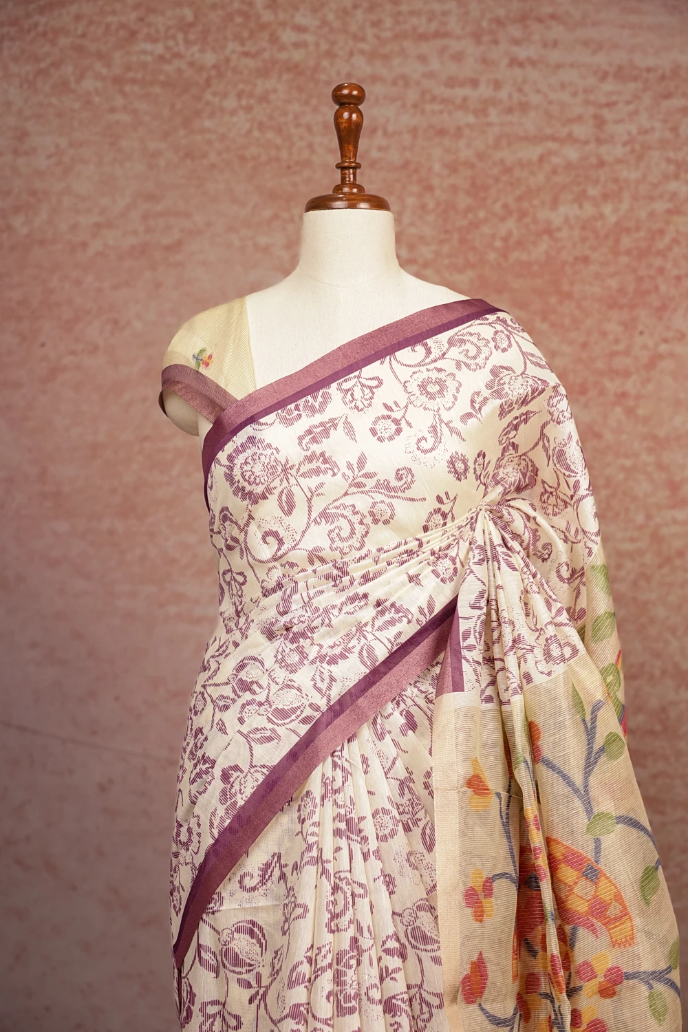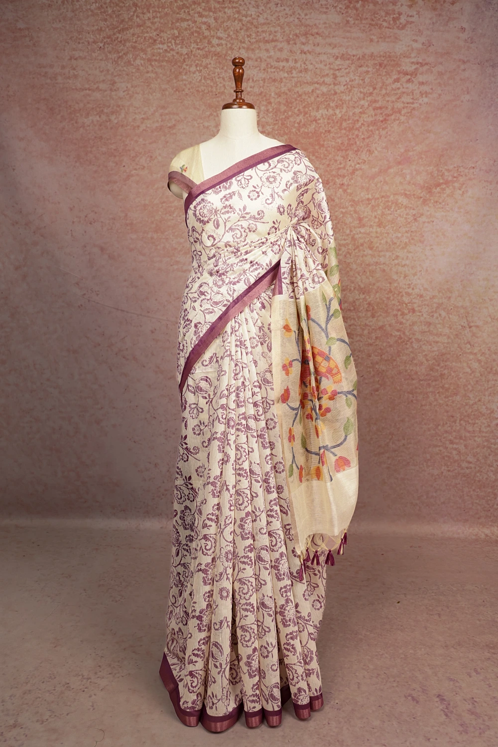 White Cotton Silk Printed Saree With Small Border. Includes Unstitched Blouse