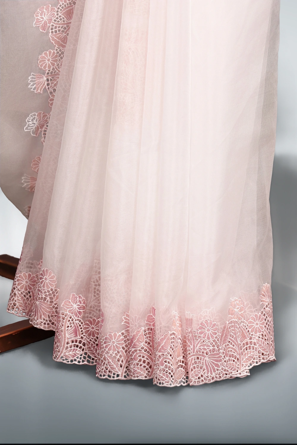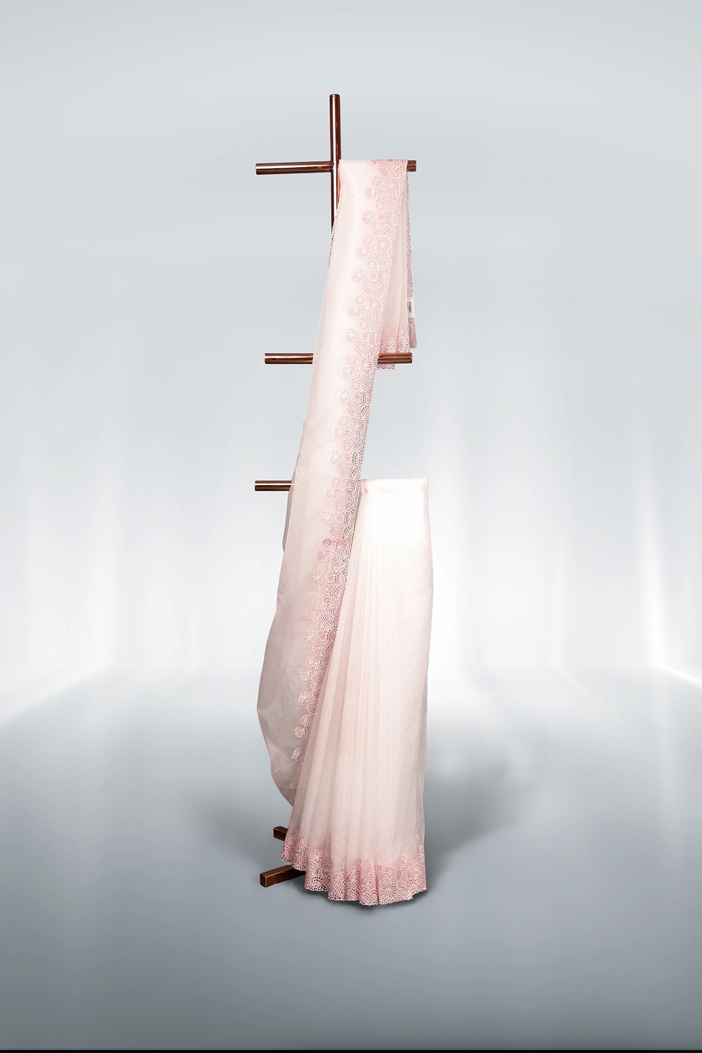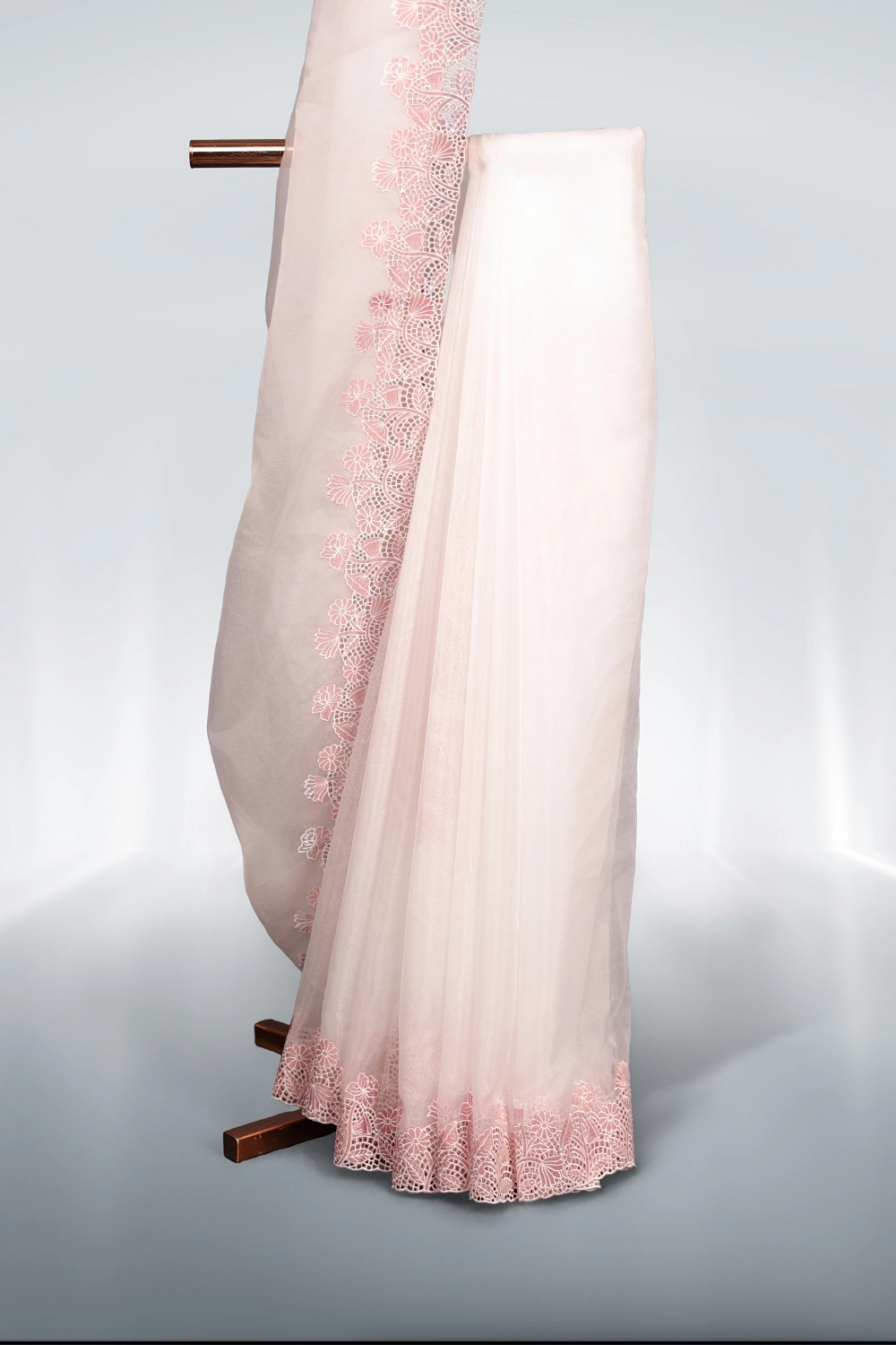 White Organza Plain Saree With Cut Work Border. Includes Un Stitched Blouse