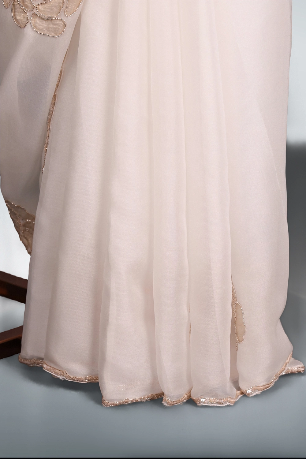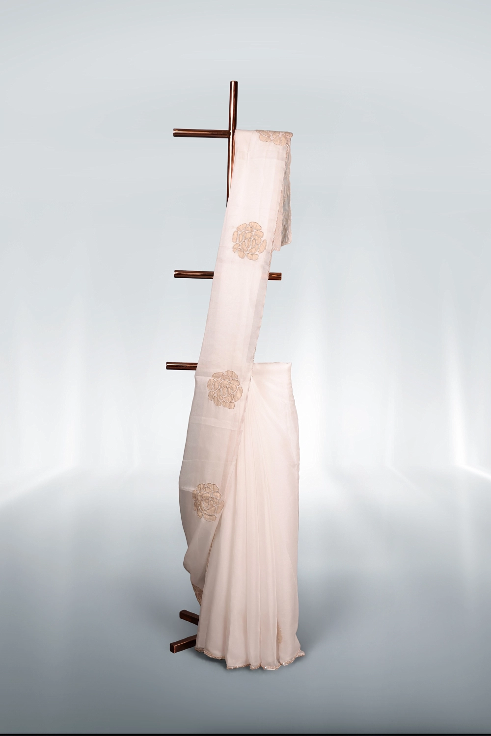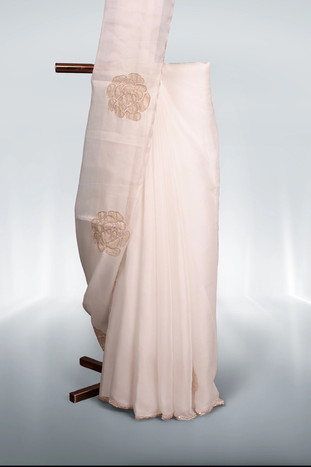 White Organza Applic Work Saree With Scallop Border. Includes Un Stitched Blouse