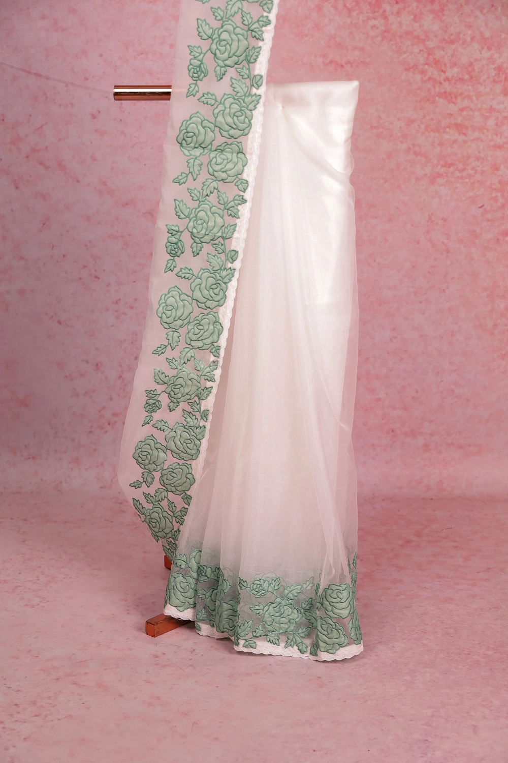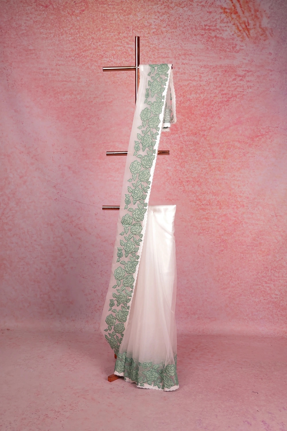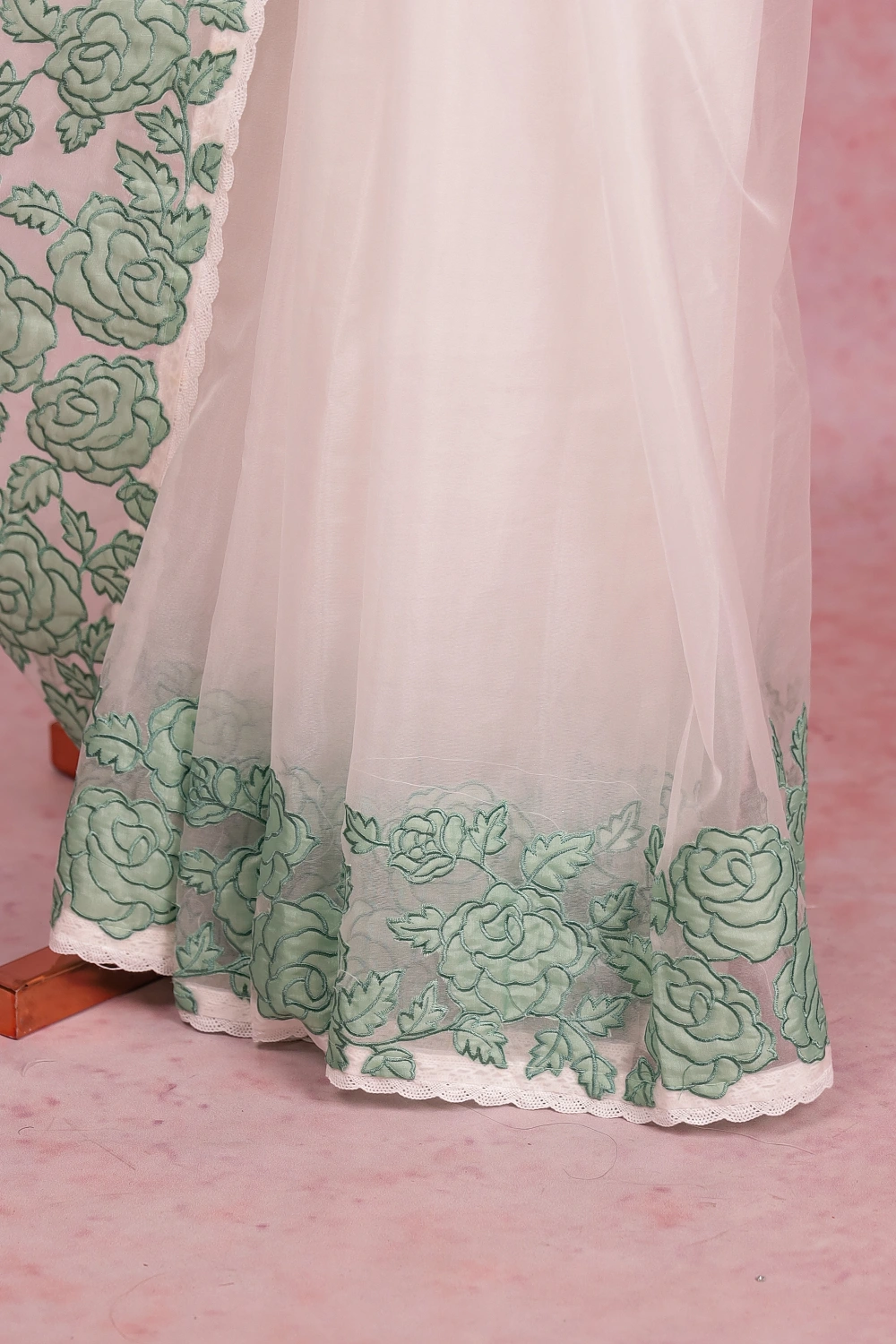 White Organza Plain Saree with Applic Border. Includes Unstitched Blouse