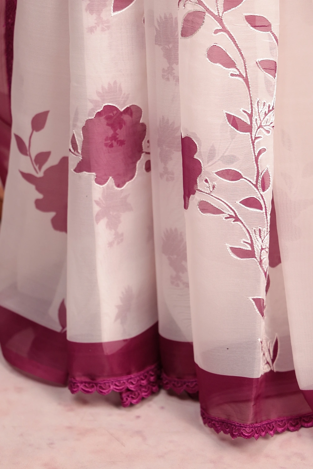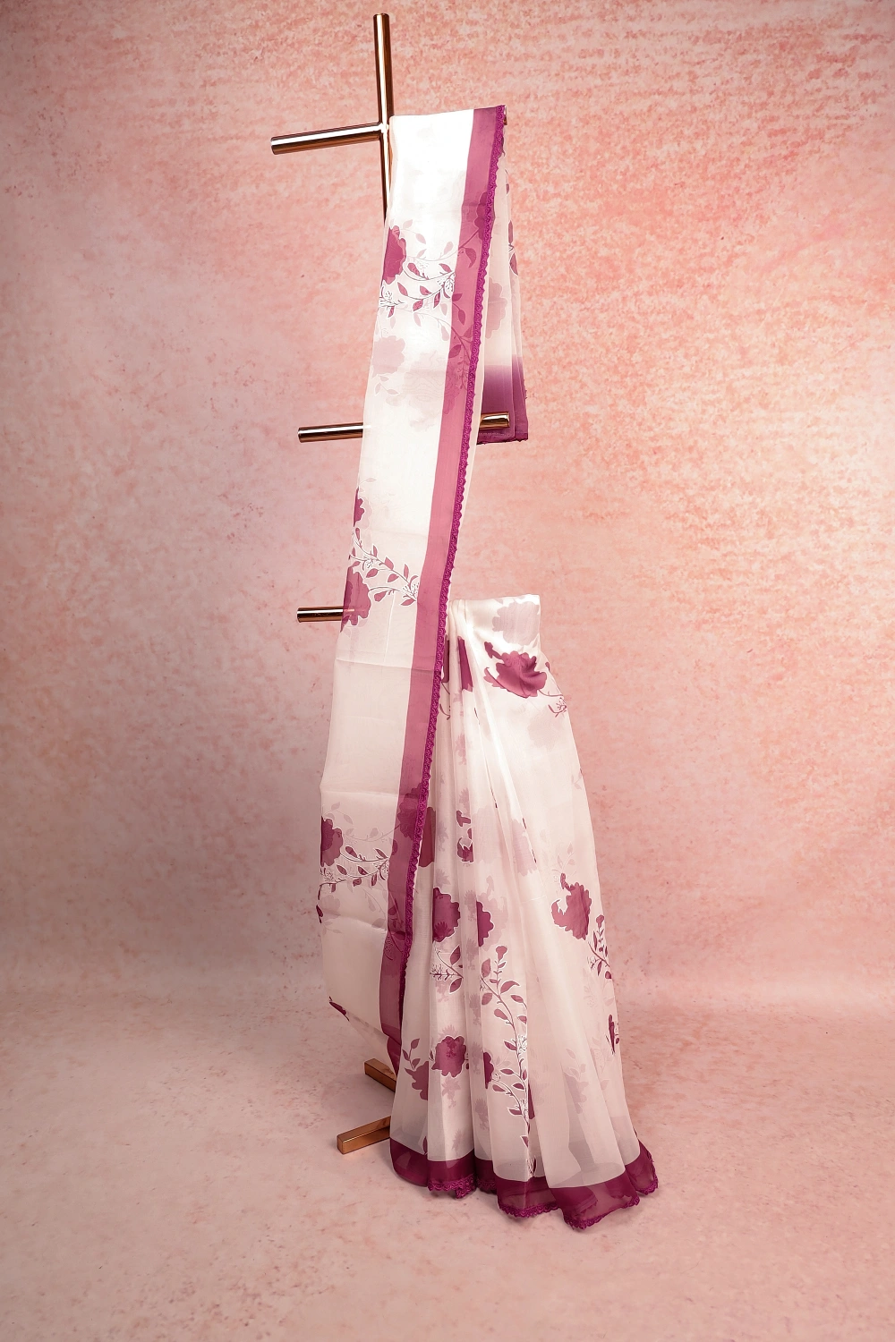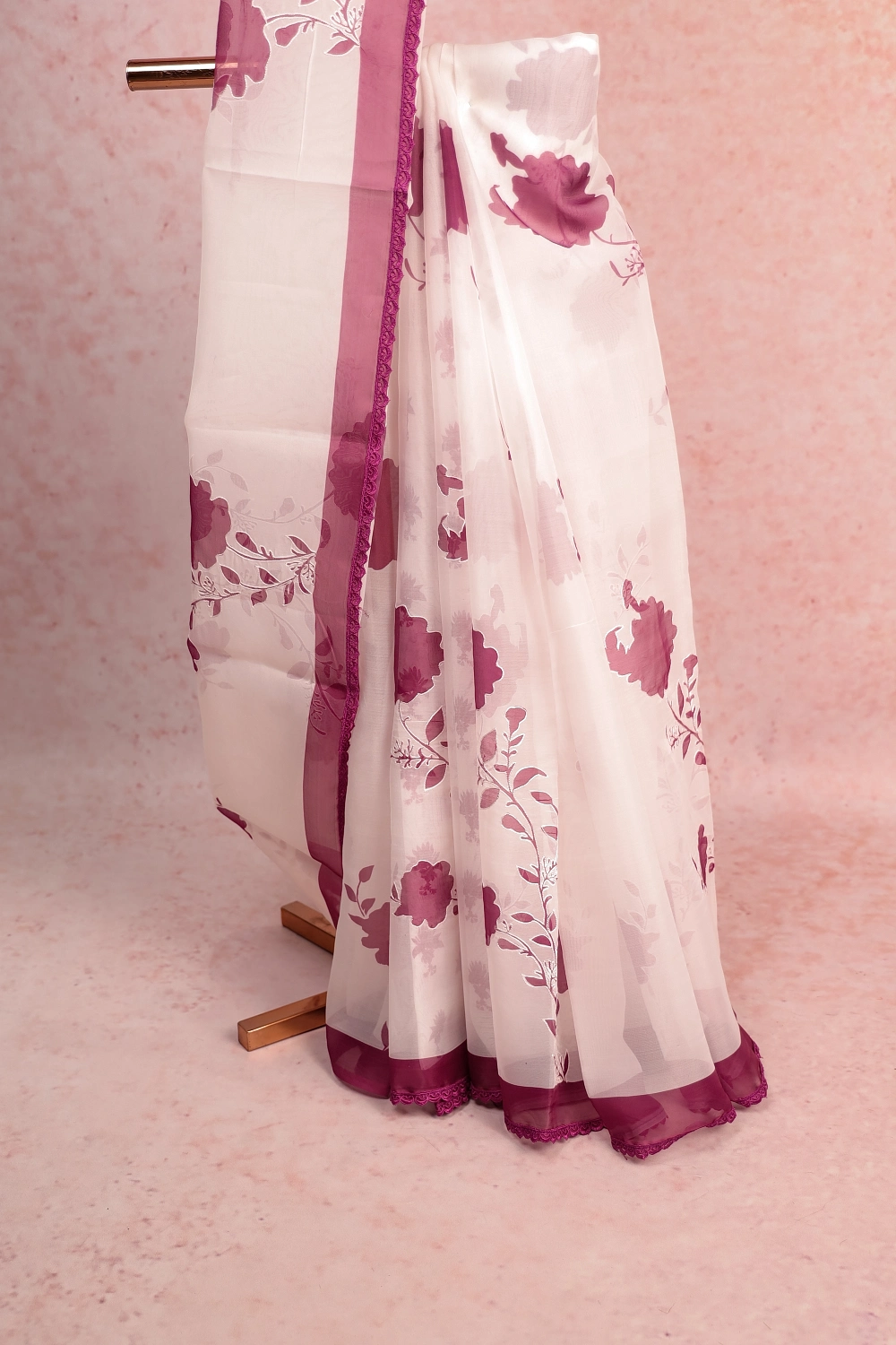 White Organza Printed Saree with Contrast Border. Includes Un stitched Blouse