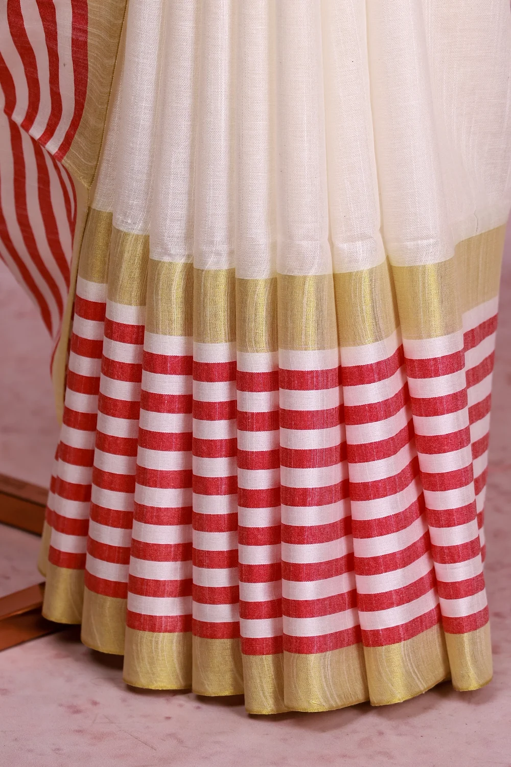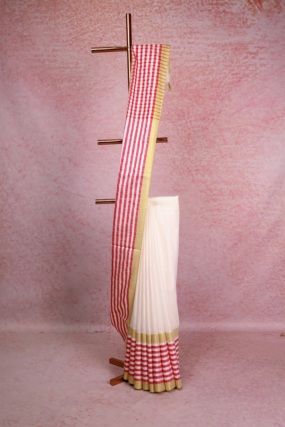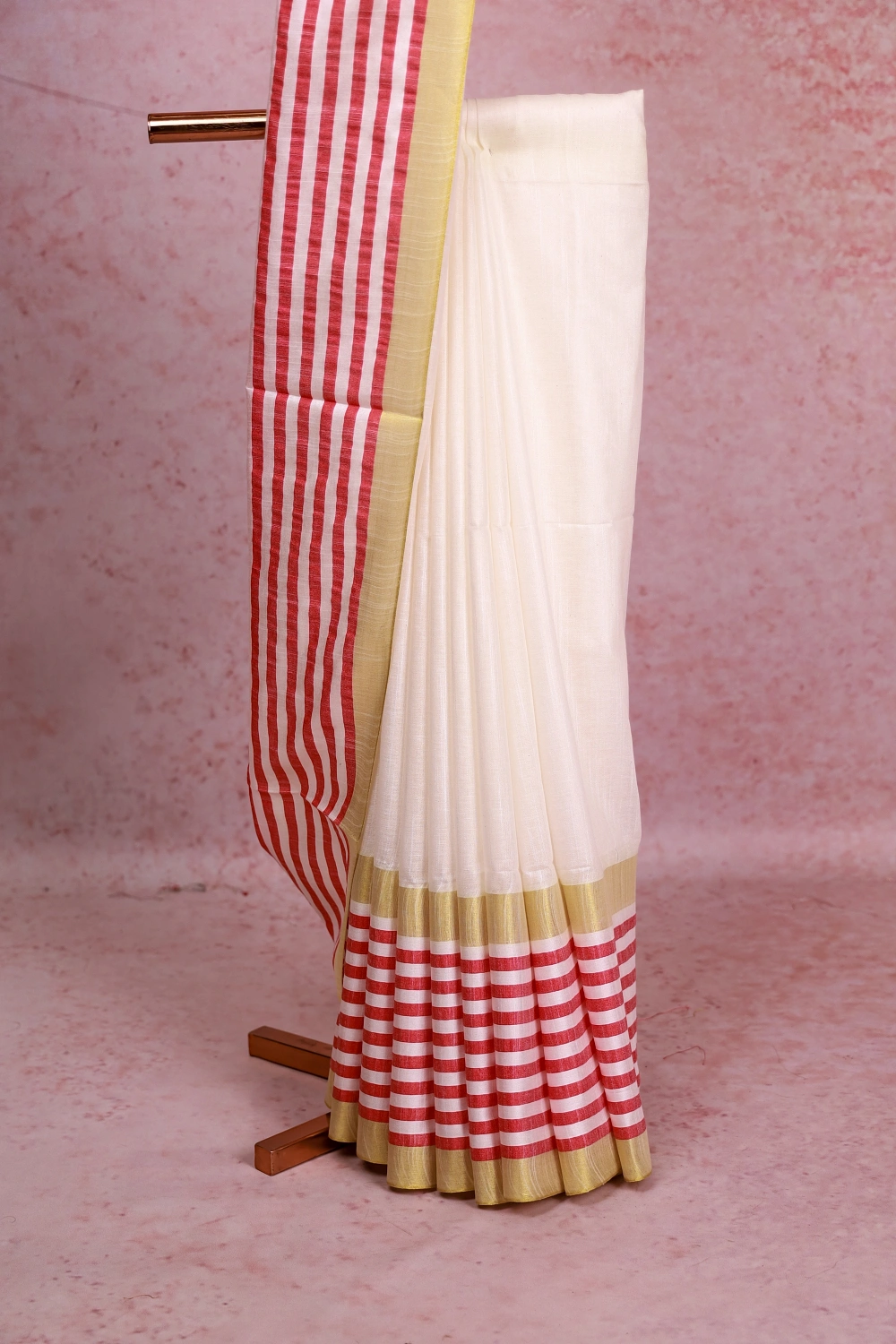 White Semi Linen Plain Saree with Zari Border. Includes Unstitched Blouse