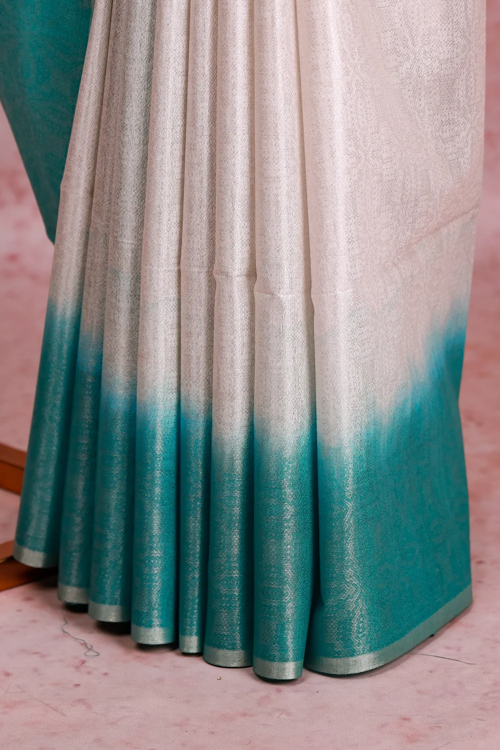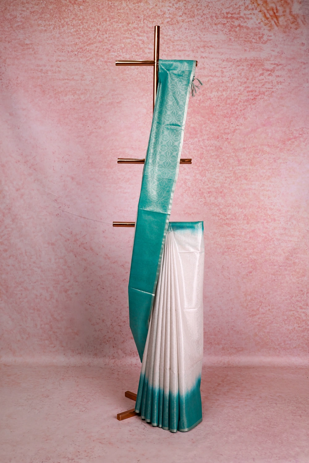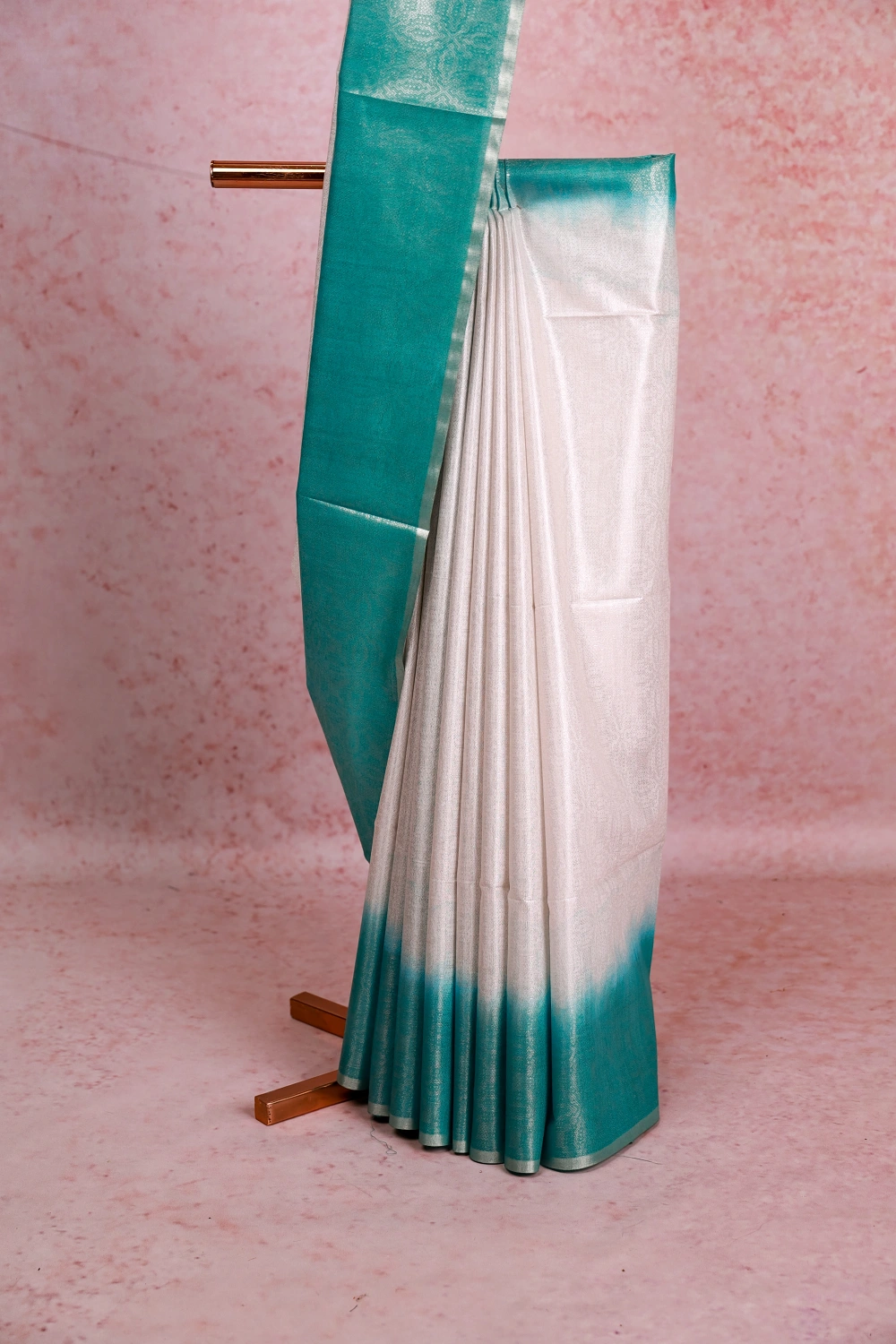 White Semi Tussar Zari Work Saree with Zari Border. Includes Unstitched Blouse