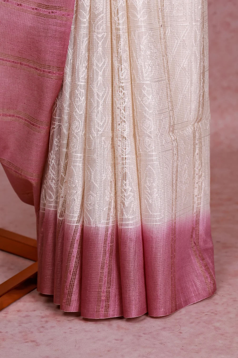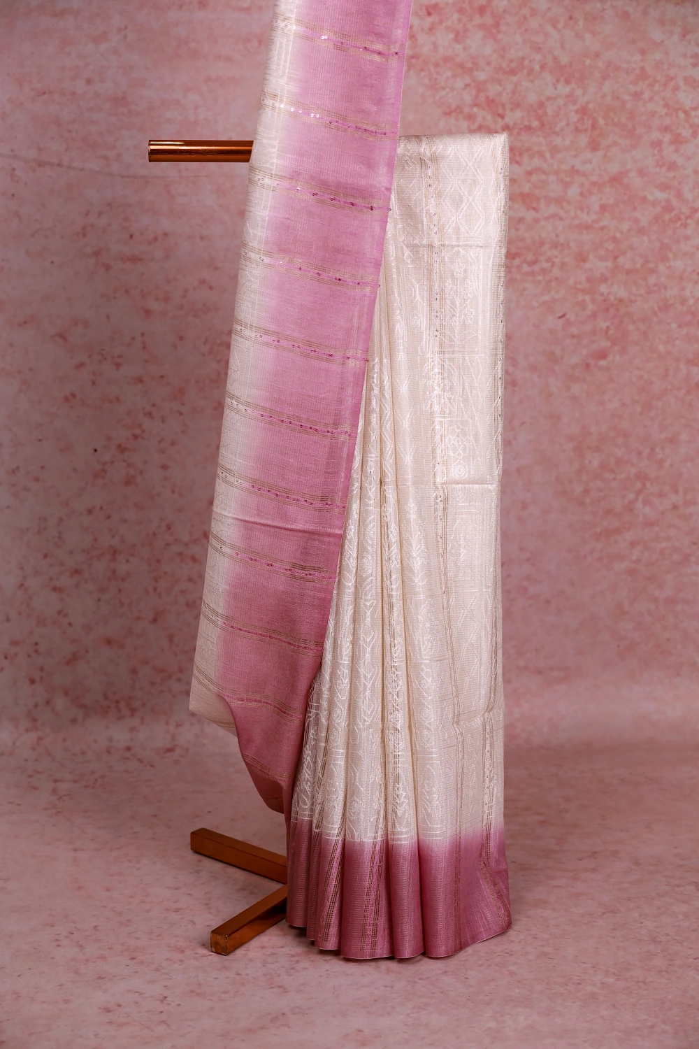 White Colour Semi Tussar Thread And Sequines Work Saree With Line Border. Includes Unstitched Blouse