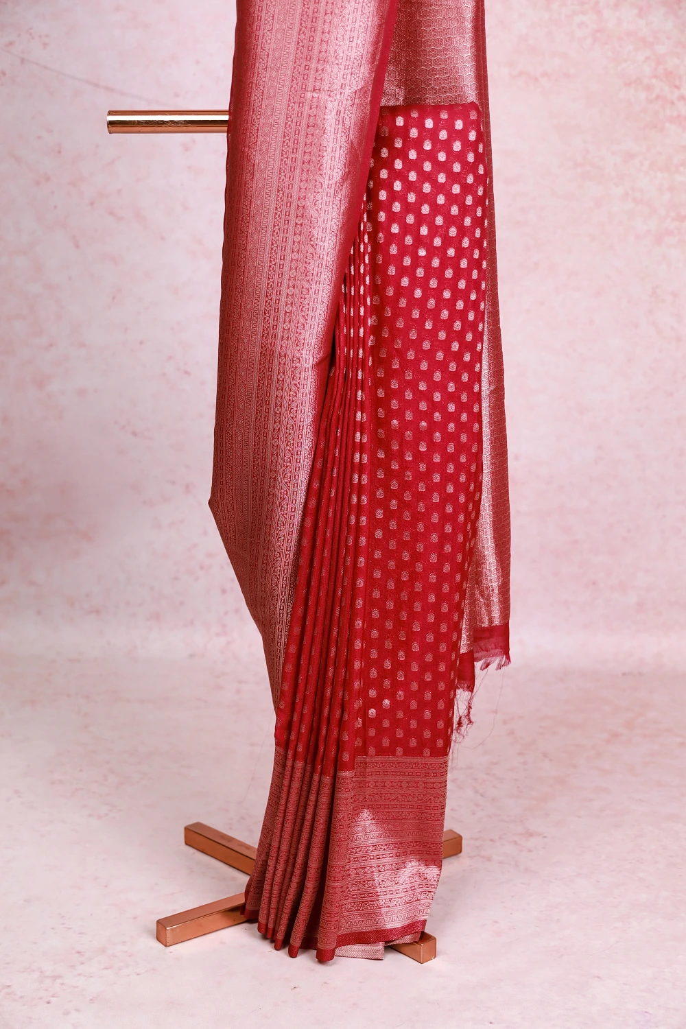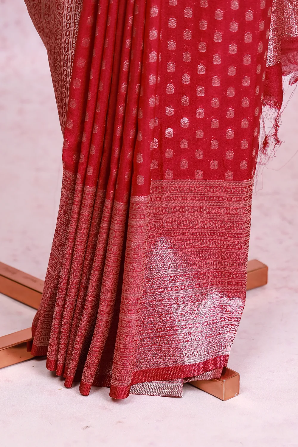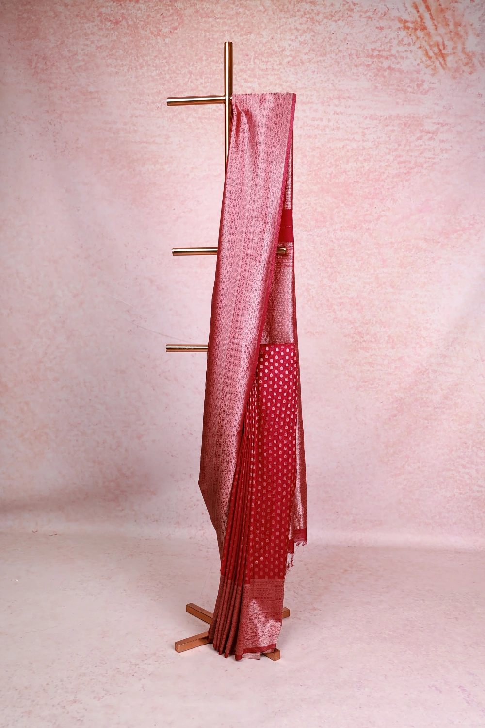 Wine Banarasi Georgette Butta Saree With Banarasi Border. Includes Un Stitched Blouse