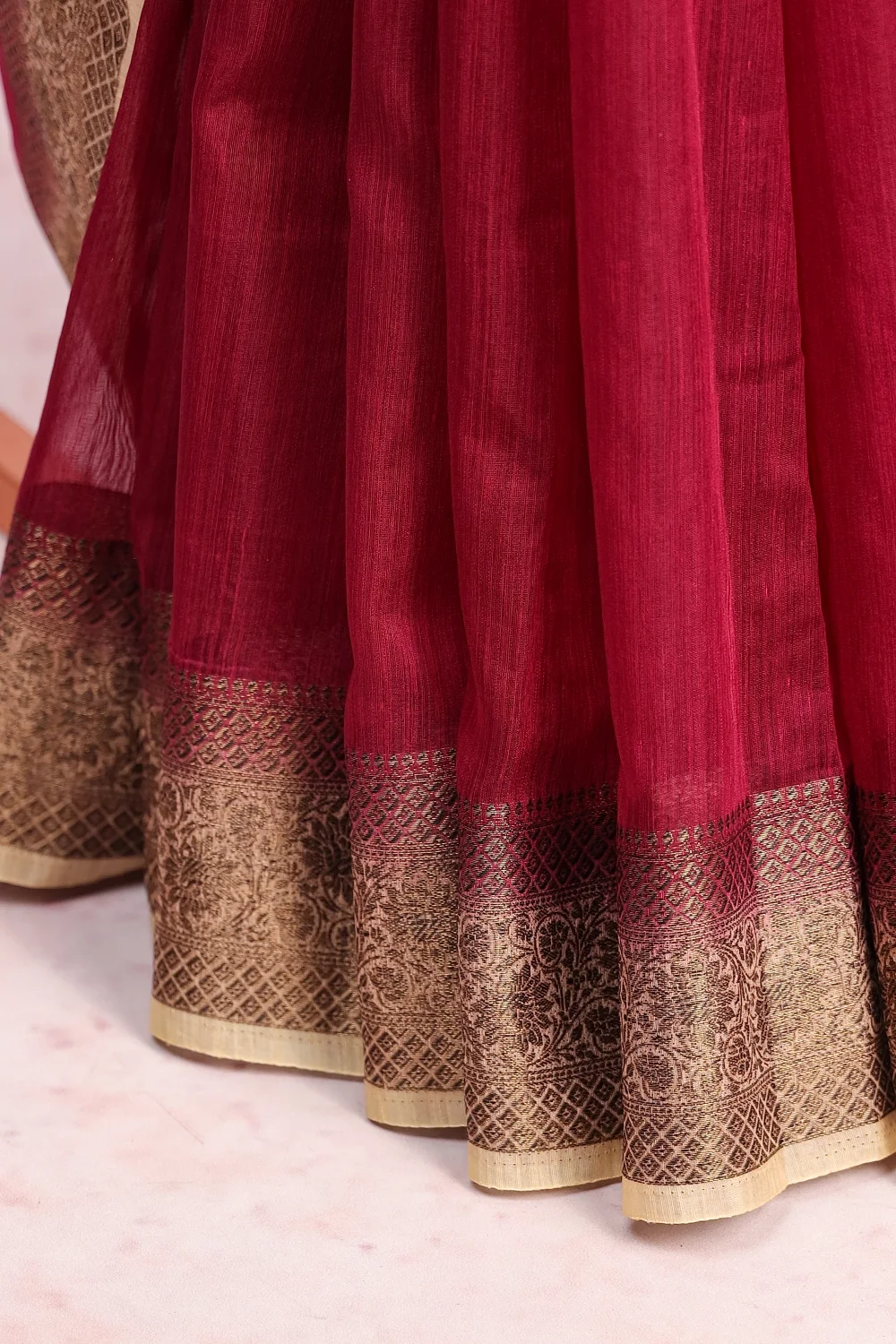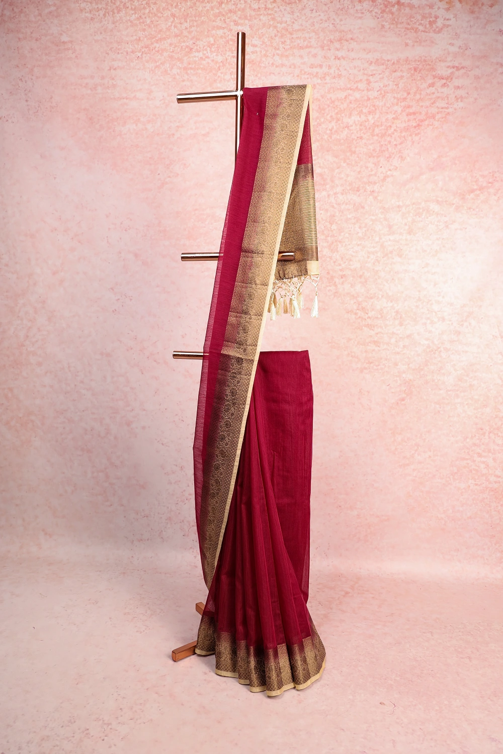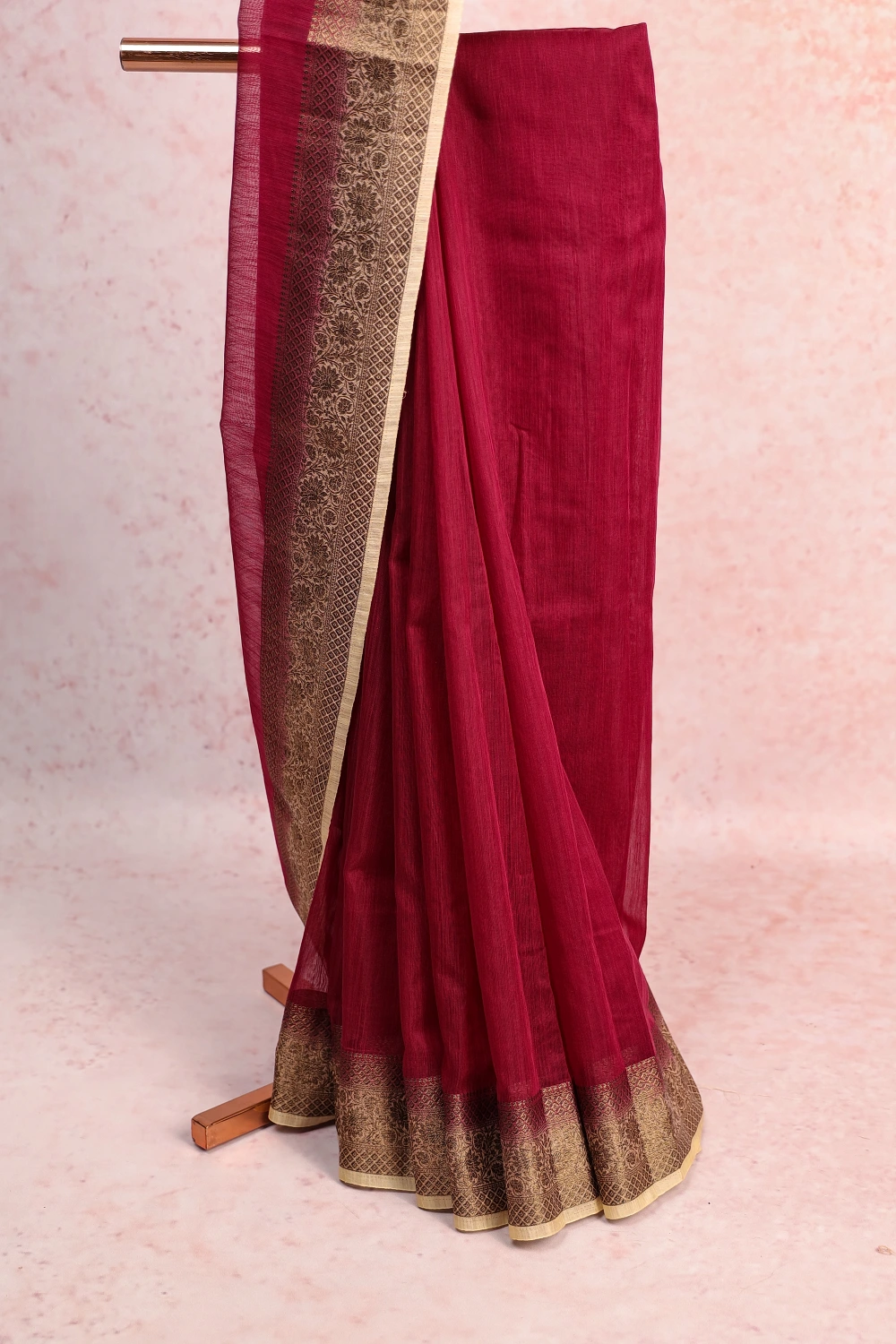 Wine Colour Semi Jute Plain Saree with Contrast Border. Includes Un stitched Blouse