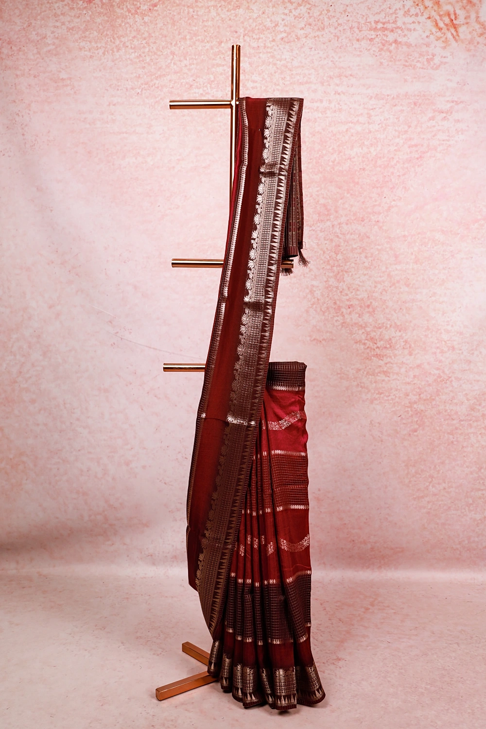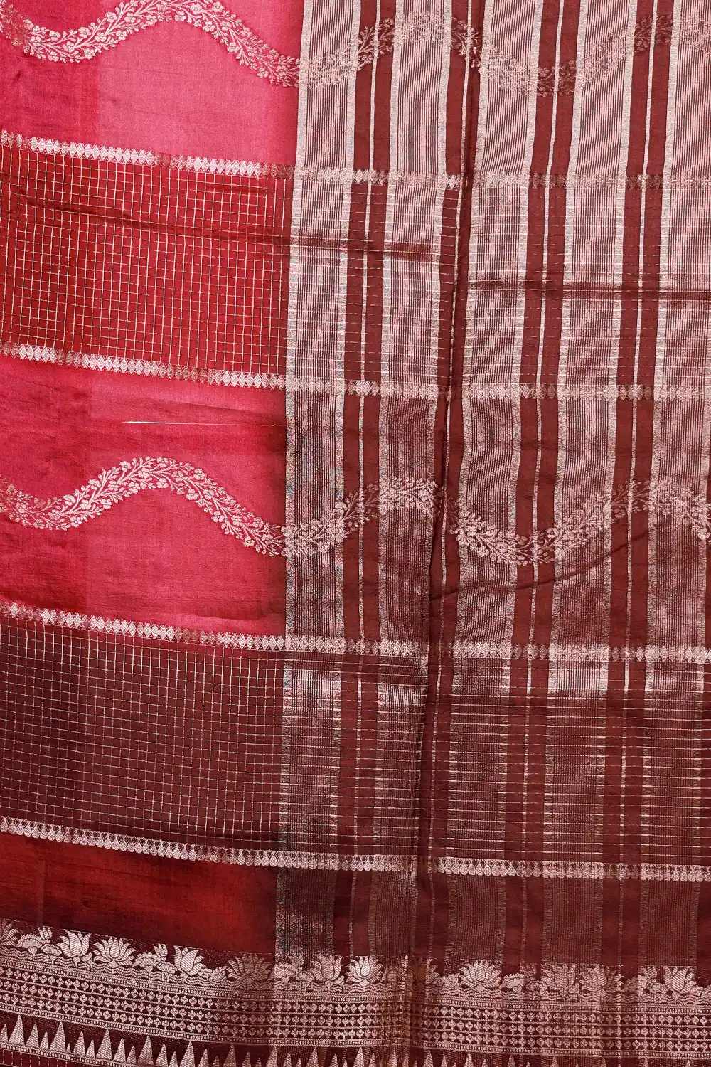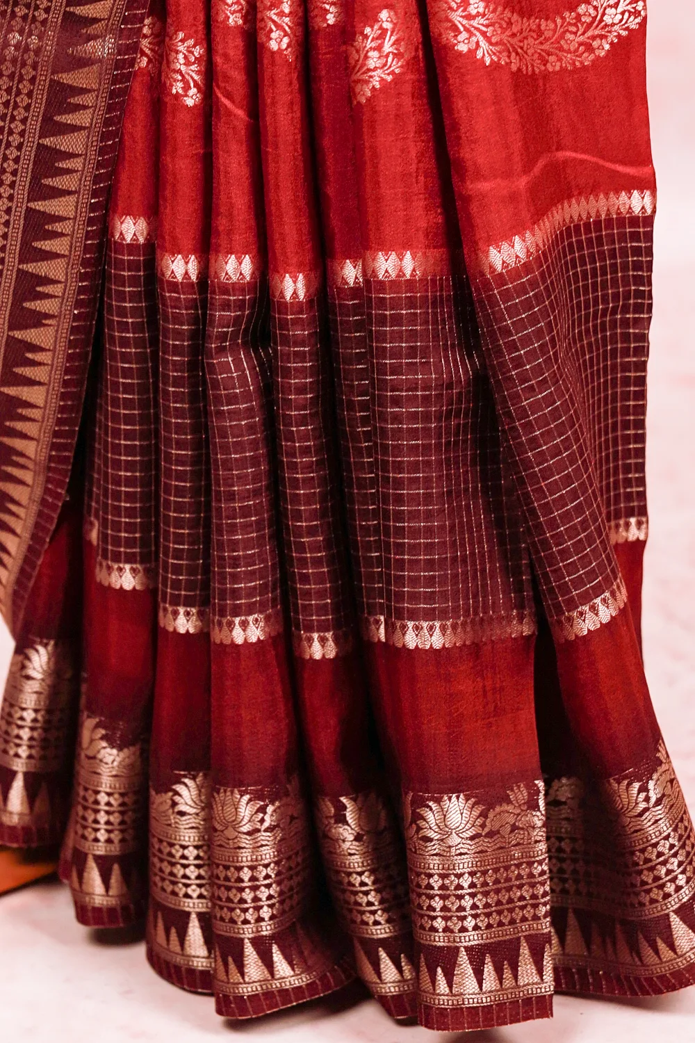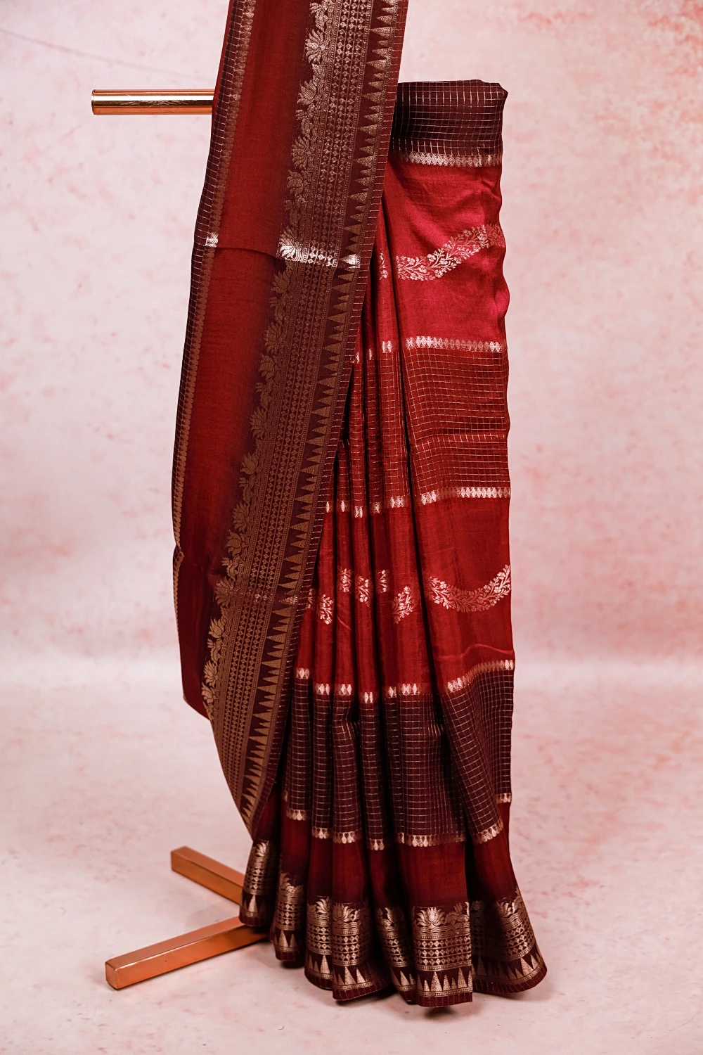 Wine Dola Silk Check And Zari Work Saree With Banarasi Border. Includes Unstitched Blouse