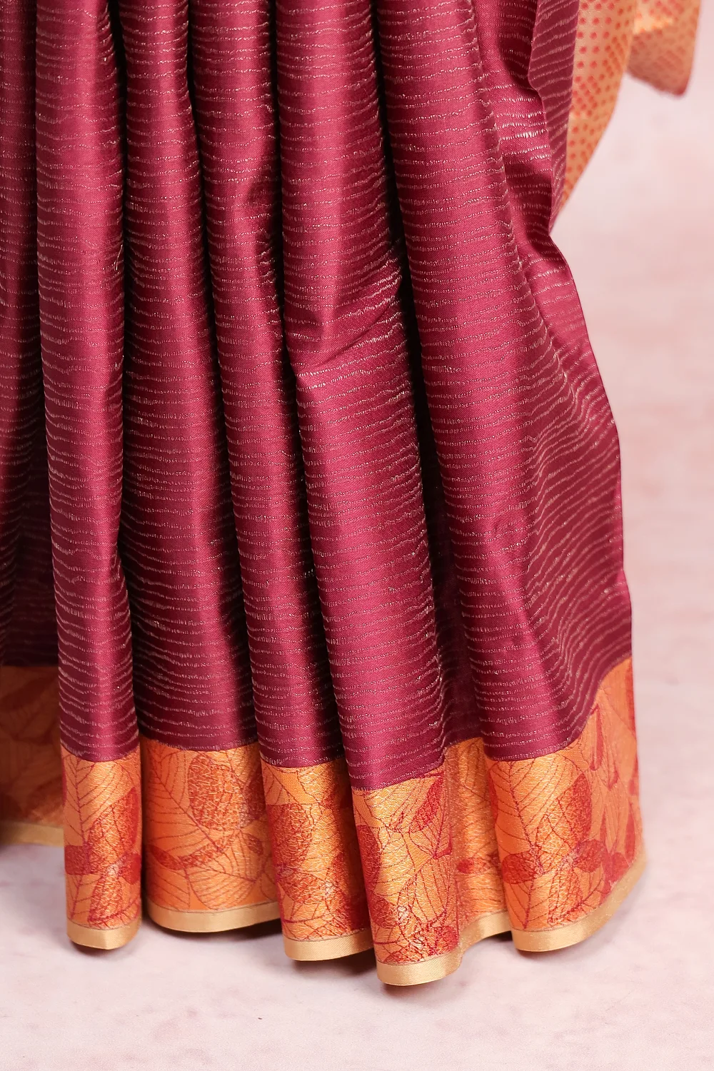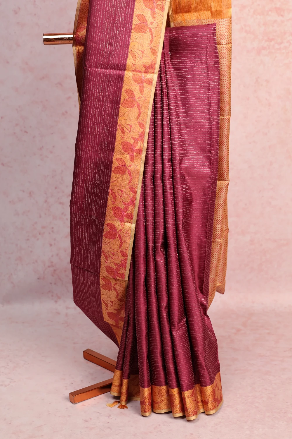 Wine Kancheepuram Silk Lines Saree with Designer Border. Includes Un stitched Blouse