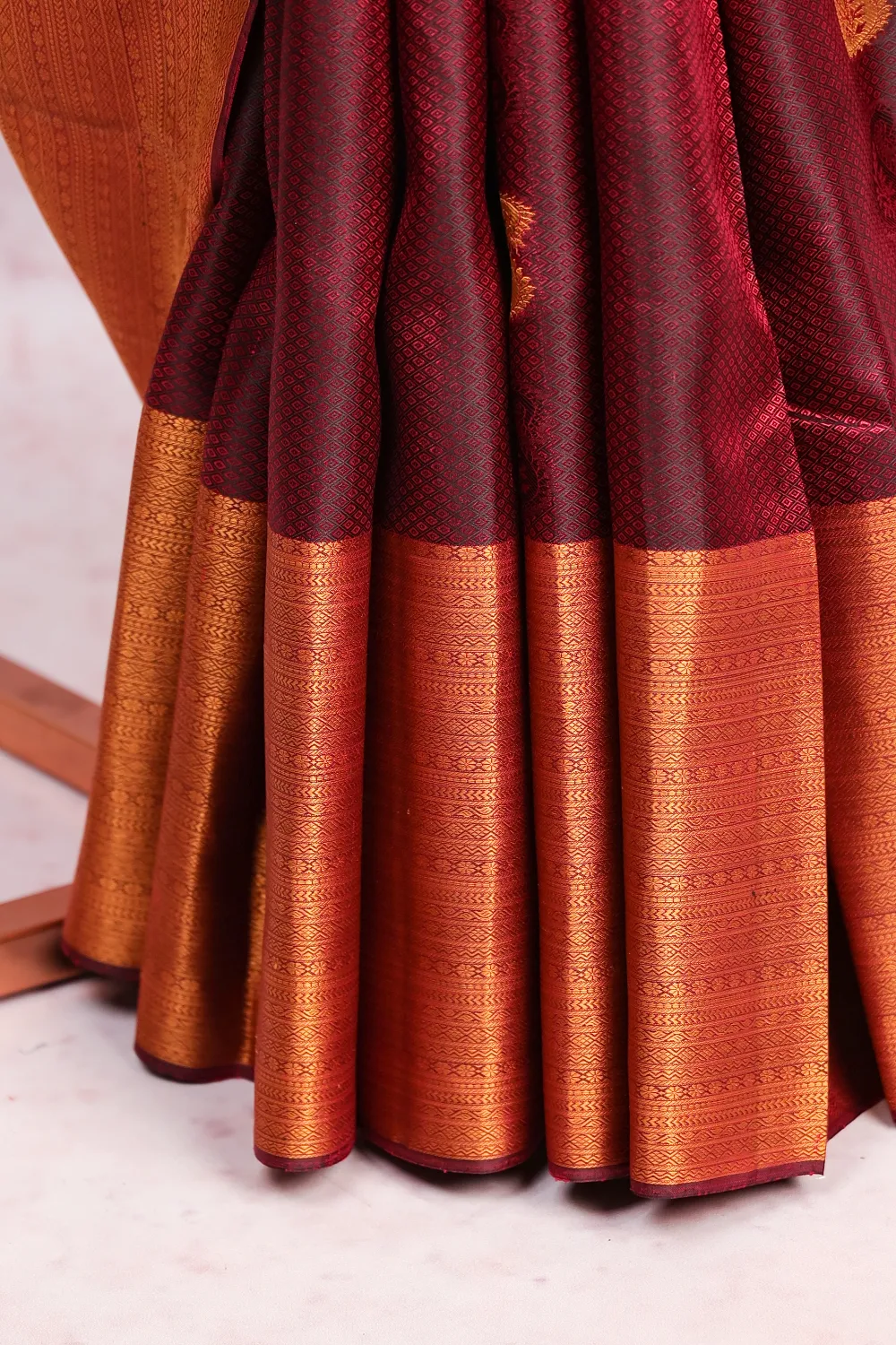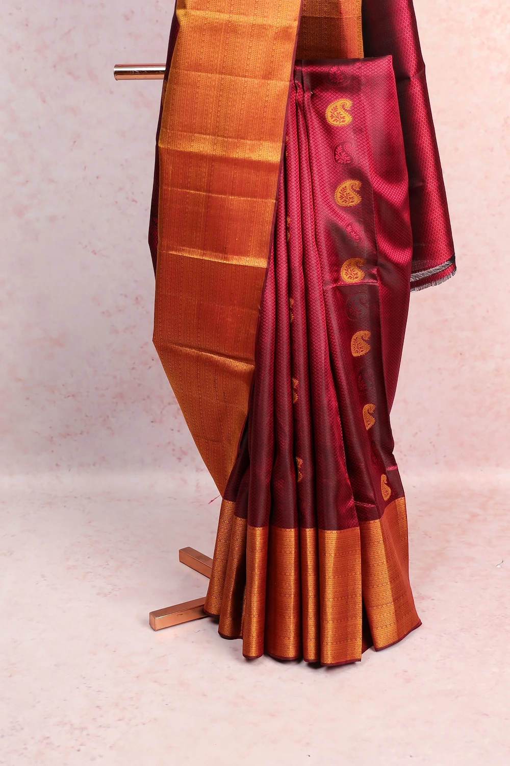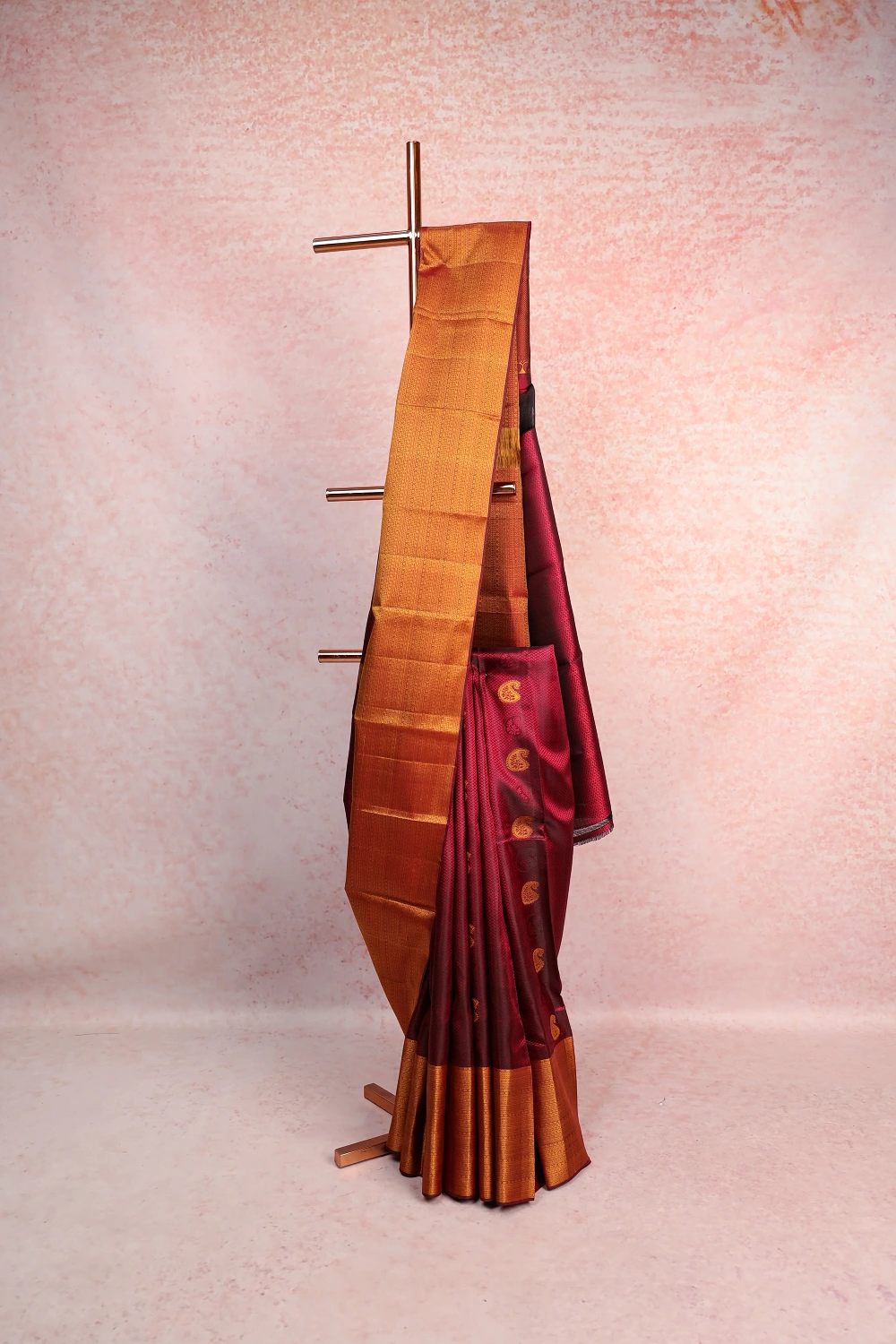 Wine Kancheepuram Brocade Saree With Thread Border. Includes Un Stitched Blouse