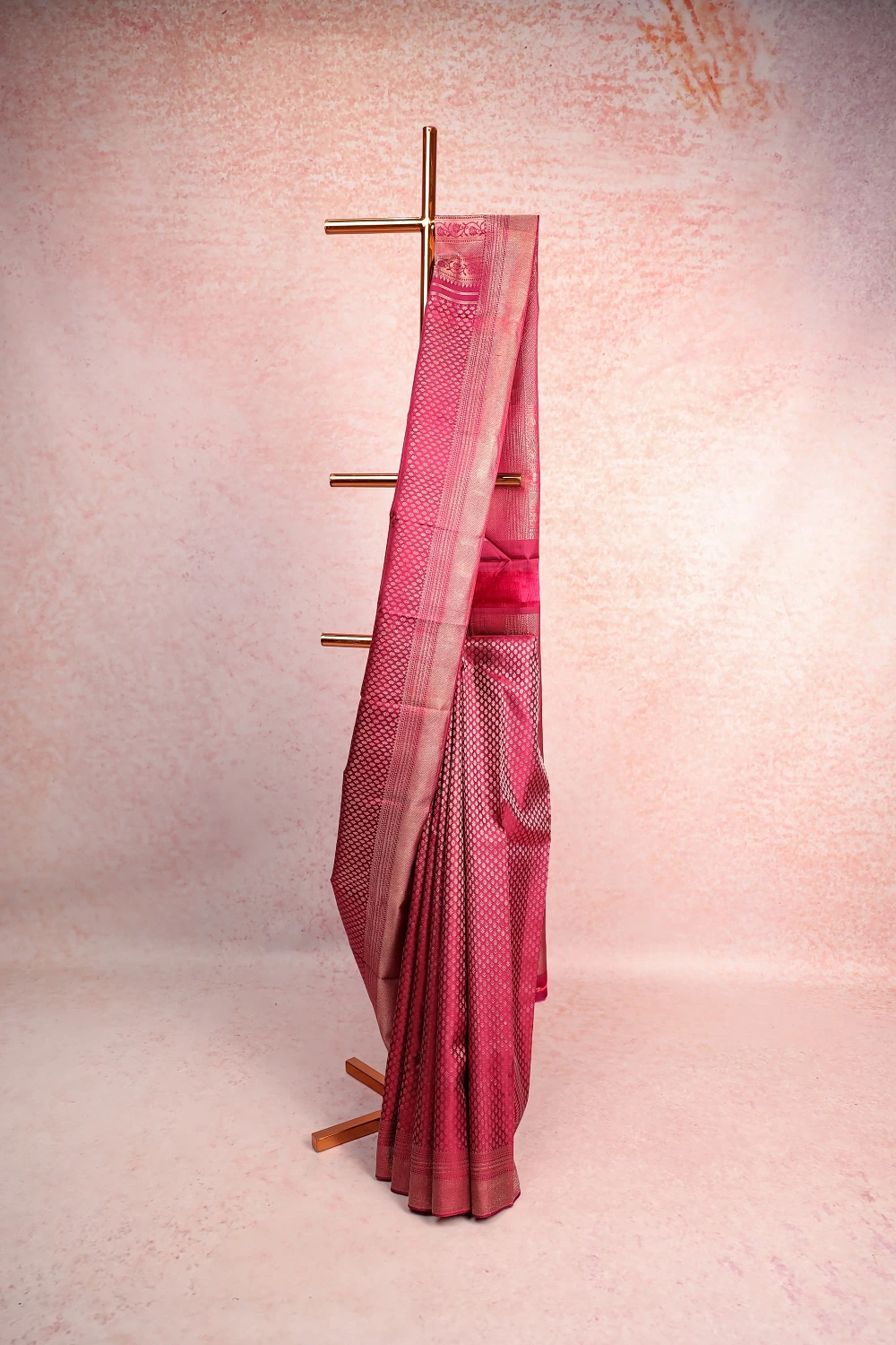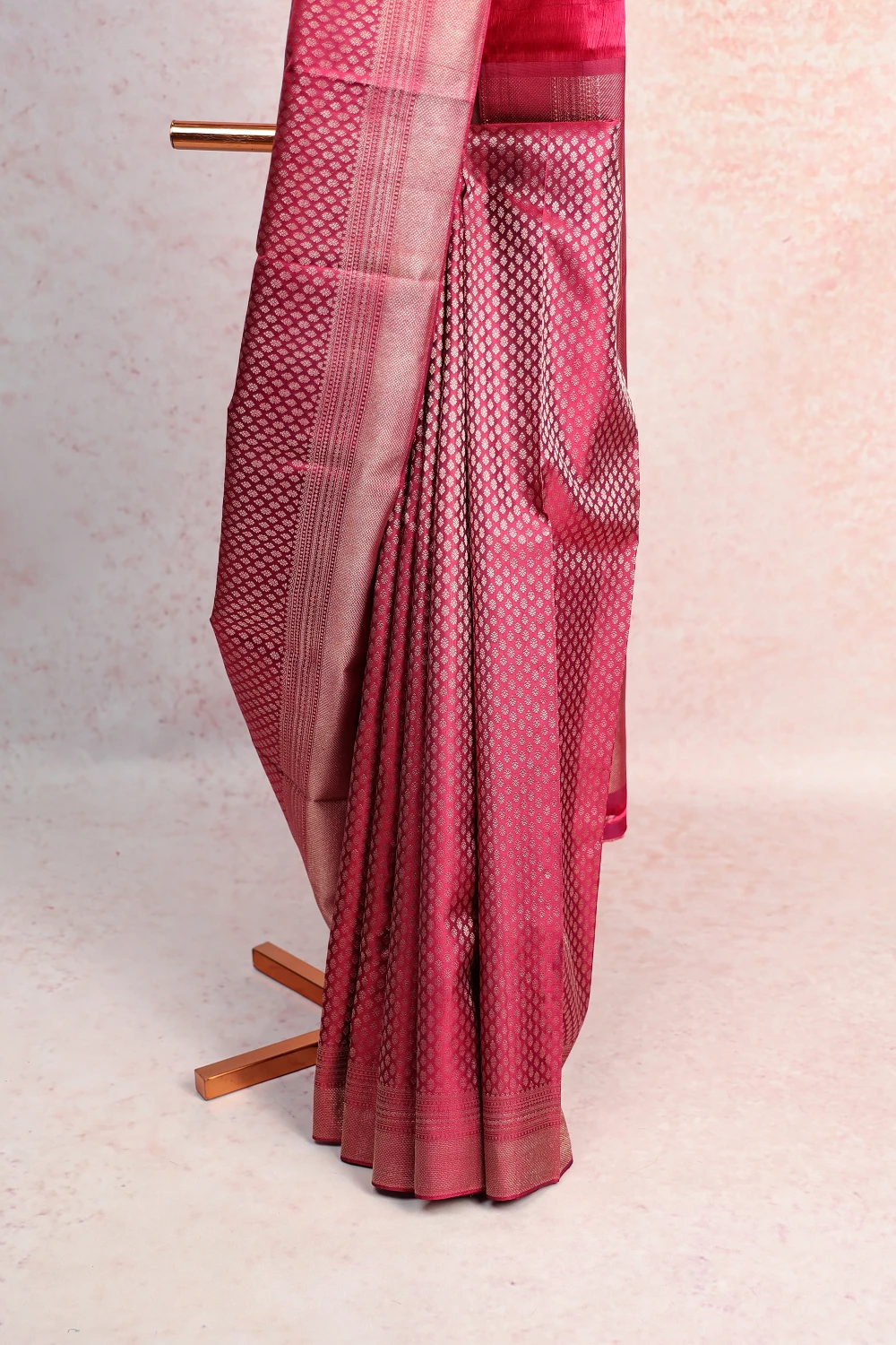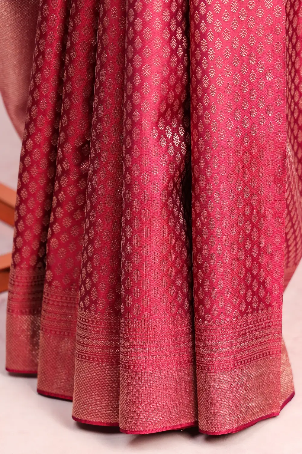 Wine Kancheepuram Silk Brocade Saree with Line Border. Includes Unstitched Blouse