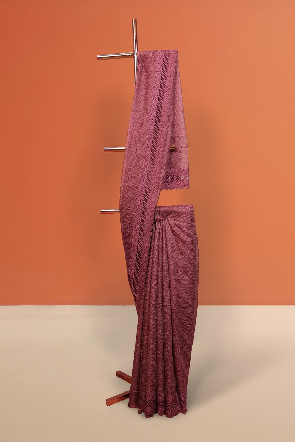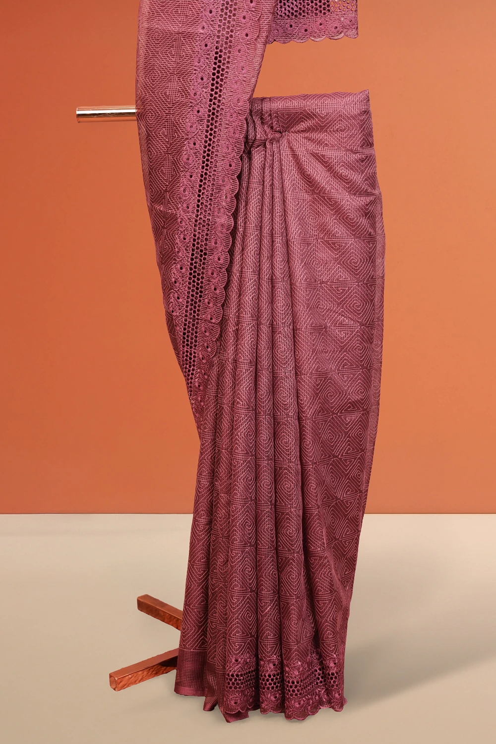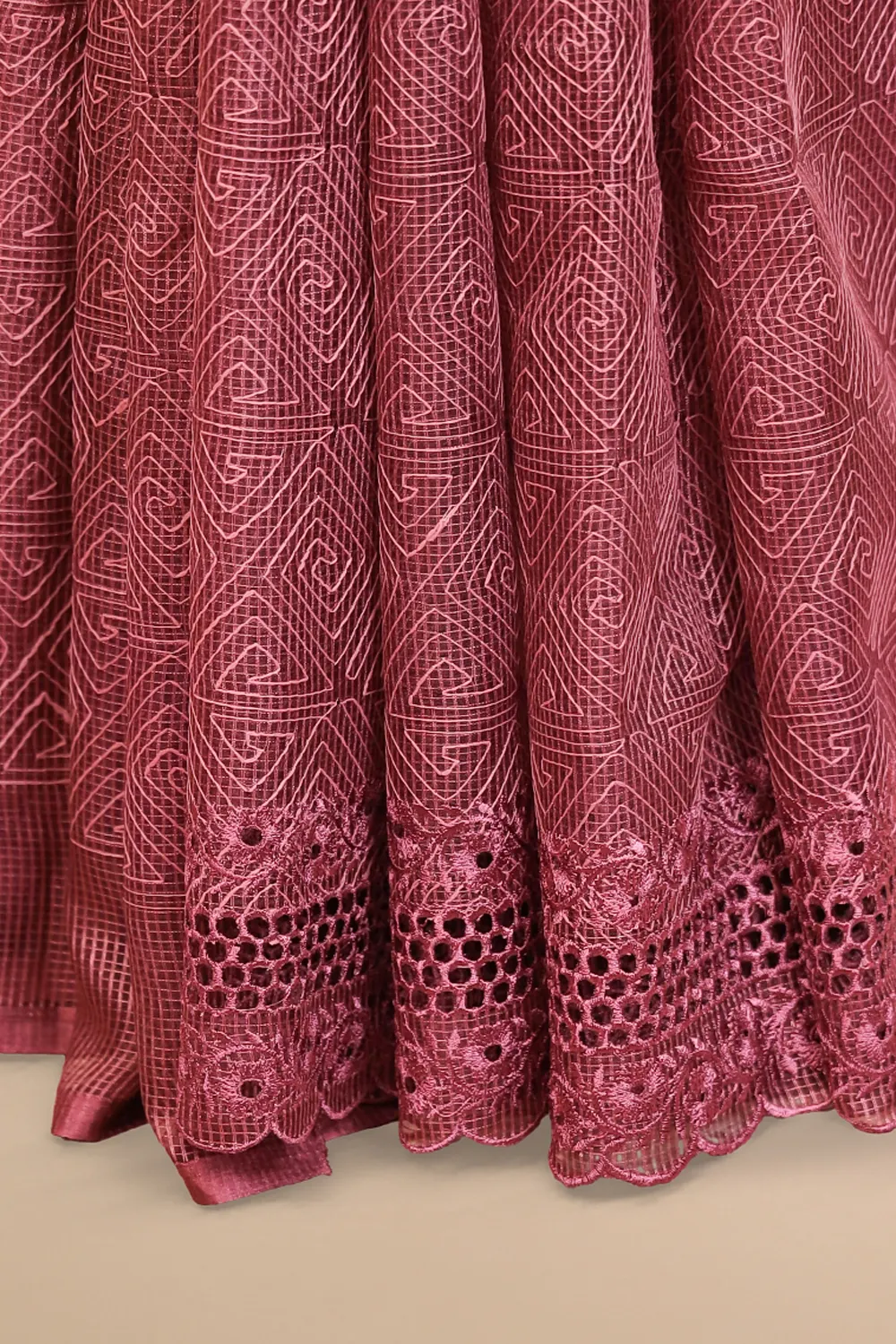 Wine Net Kota Embroidary Saree with Cut Work Border. Includes Unstitched Blouse