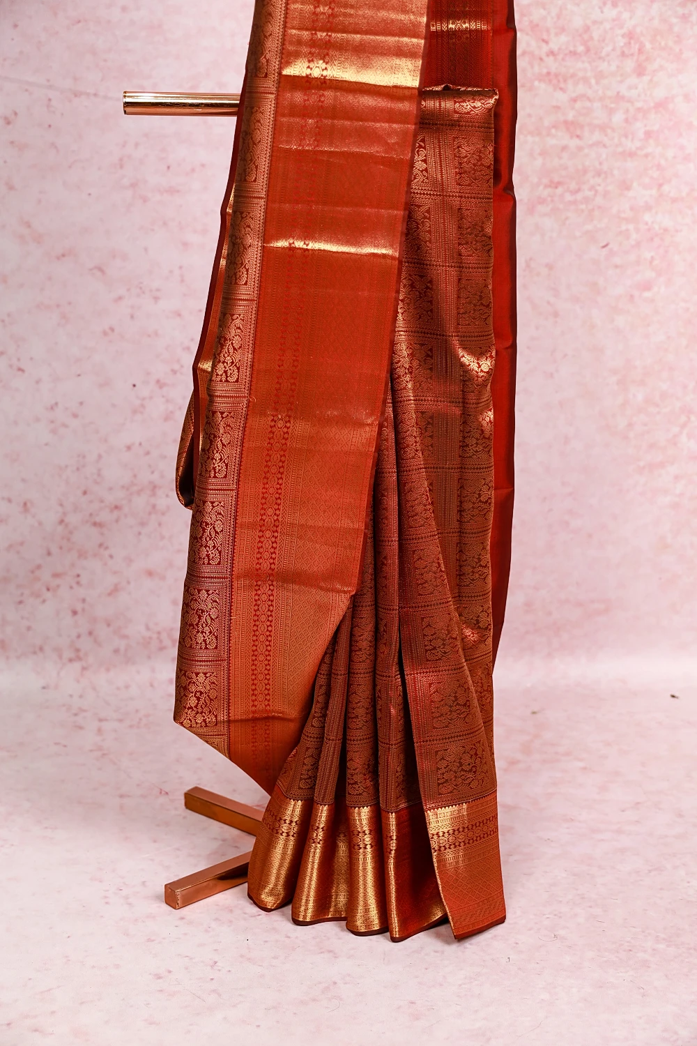 Wine Red Kancheepuram Silk Banarasi Design Saree With Traditional Fancy Border. Includes Unstitched Blouse