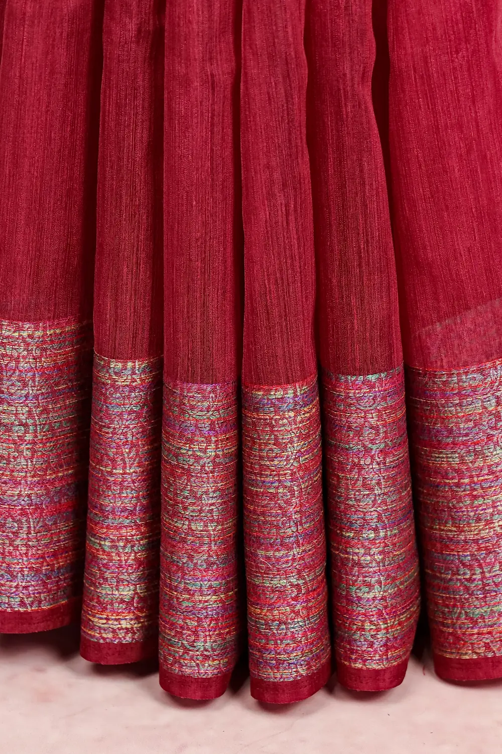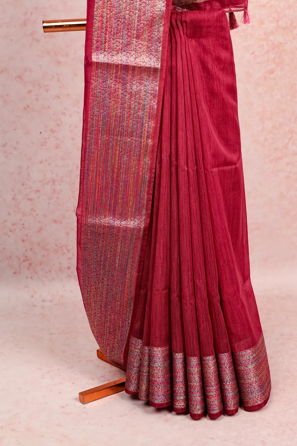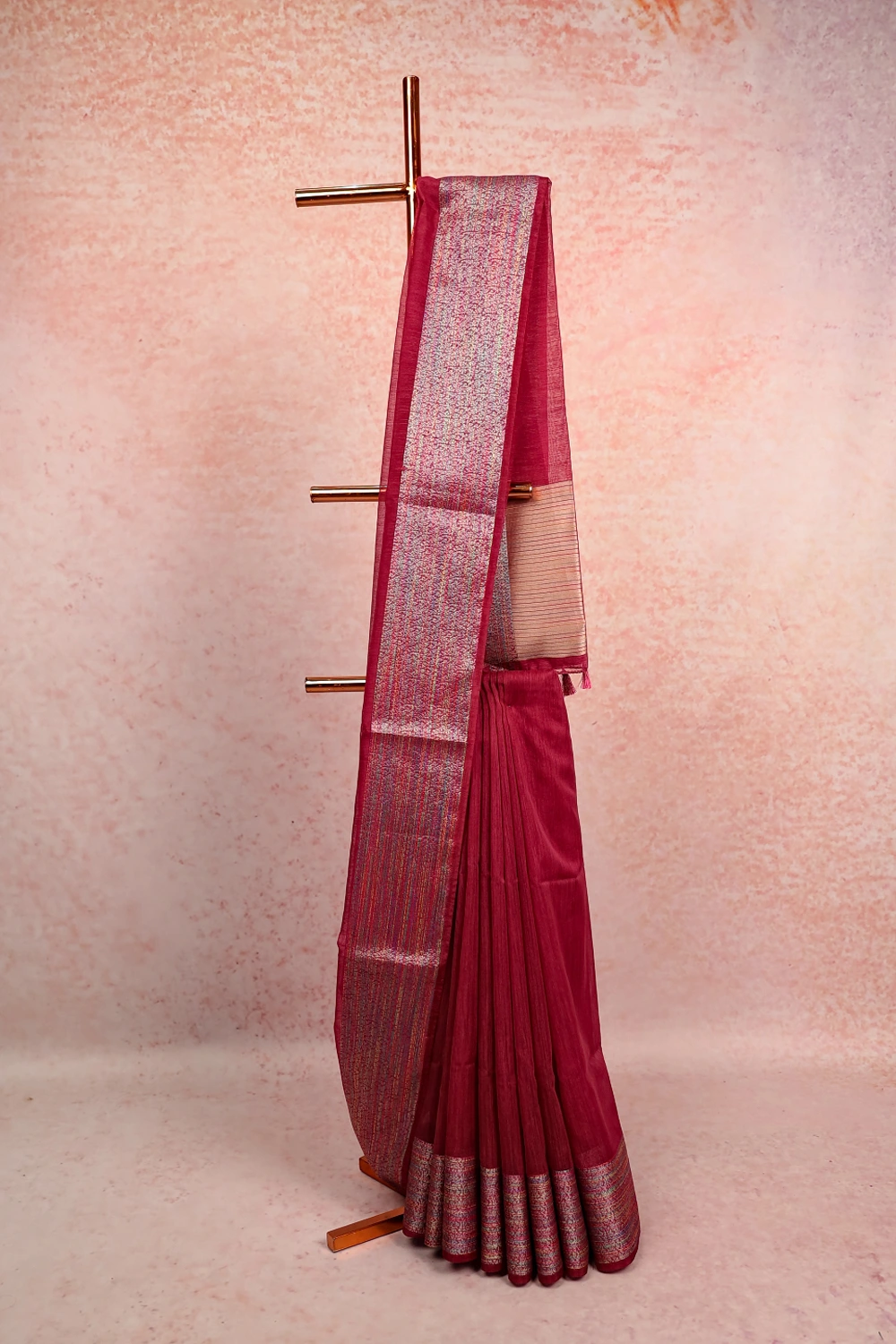 Wine Semi Jute Plain Body Saree with Designer Border. Includes Unstitched Blouse.