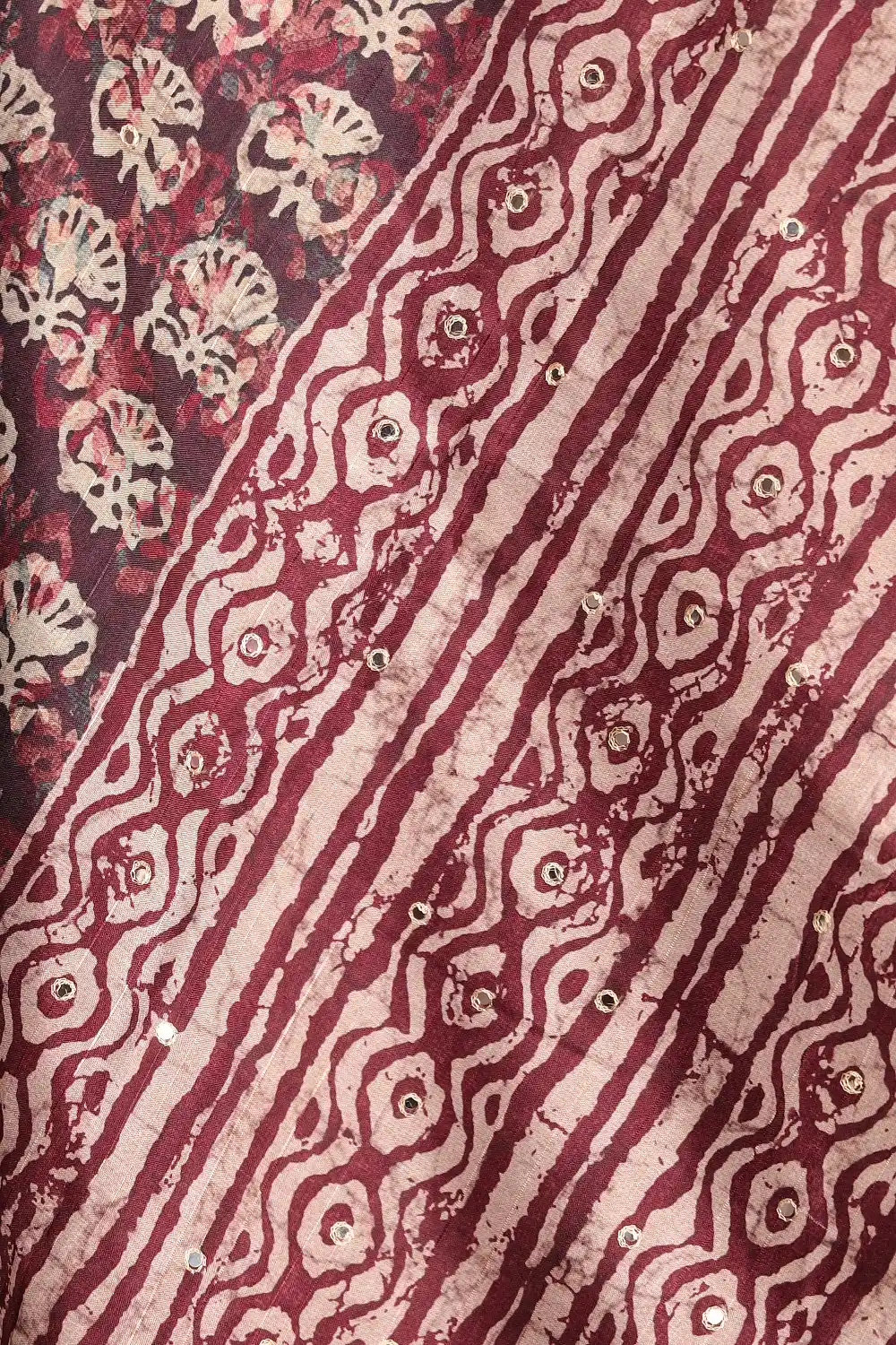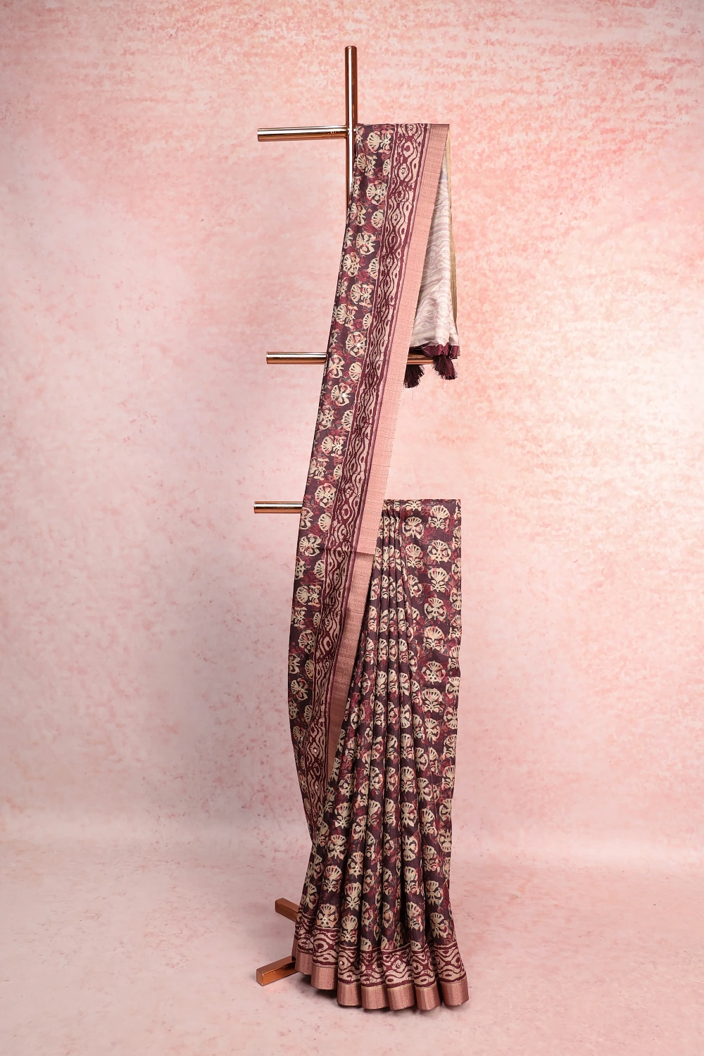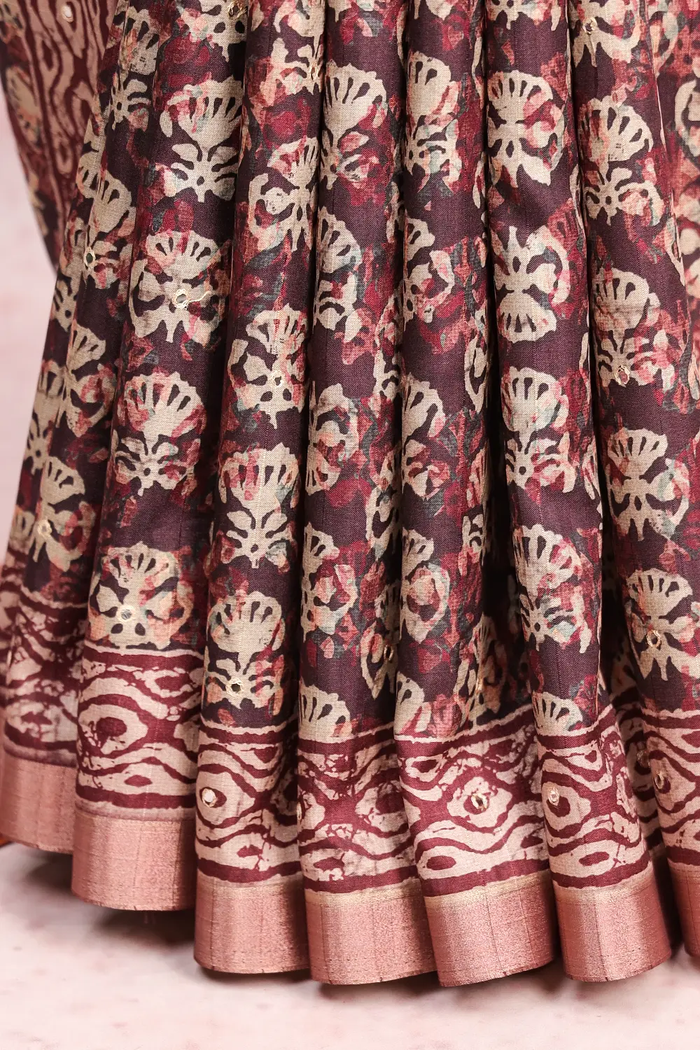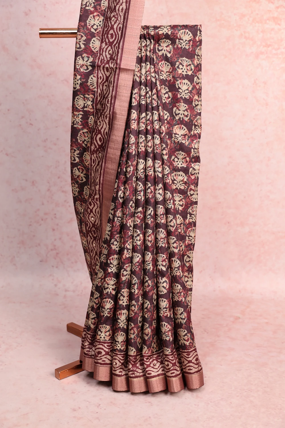Wine Semi Tussar Printed Saree with Small Border. Includes Unstitched Blouse