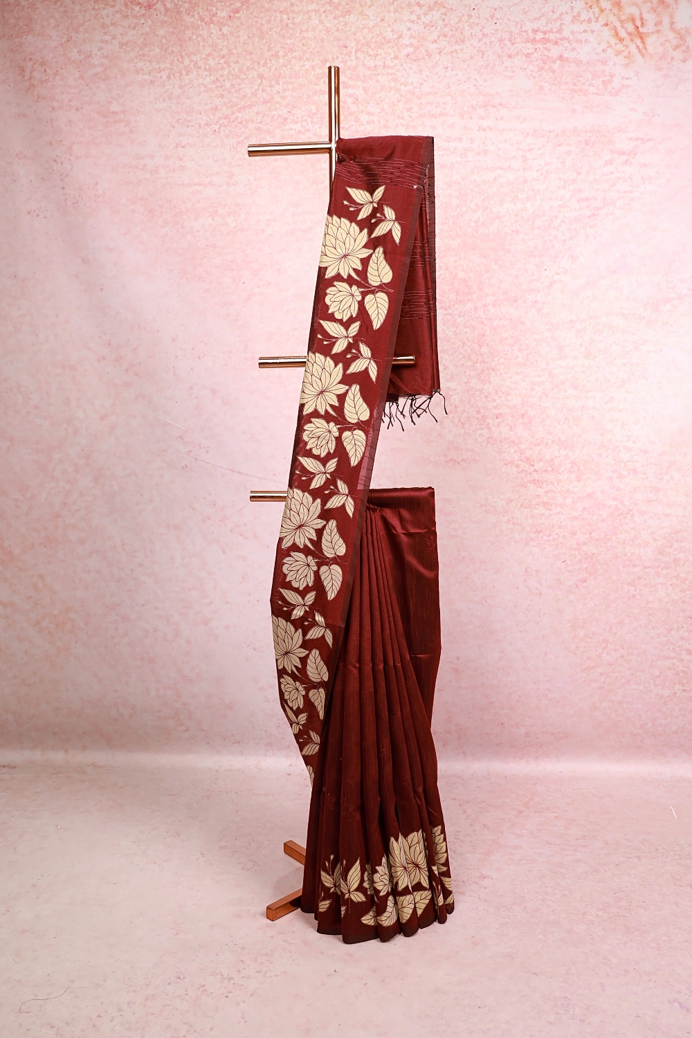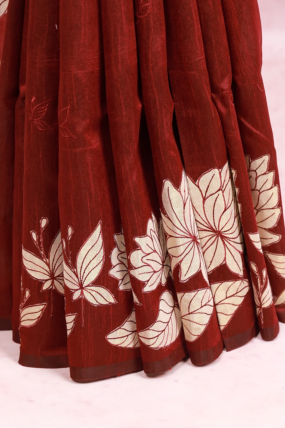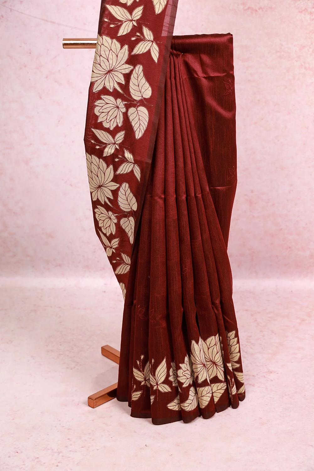 Wine Semi Tussar Thread Design Saree With Applic Border. Includes Unstitched Blouse