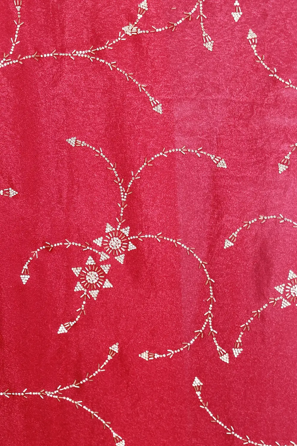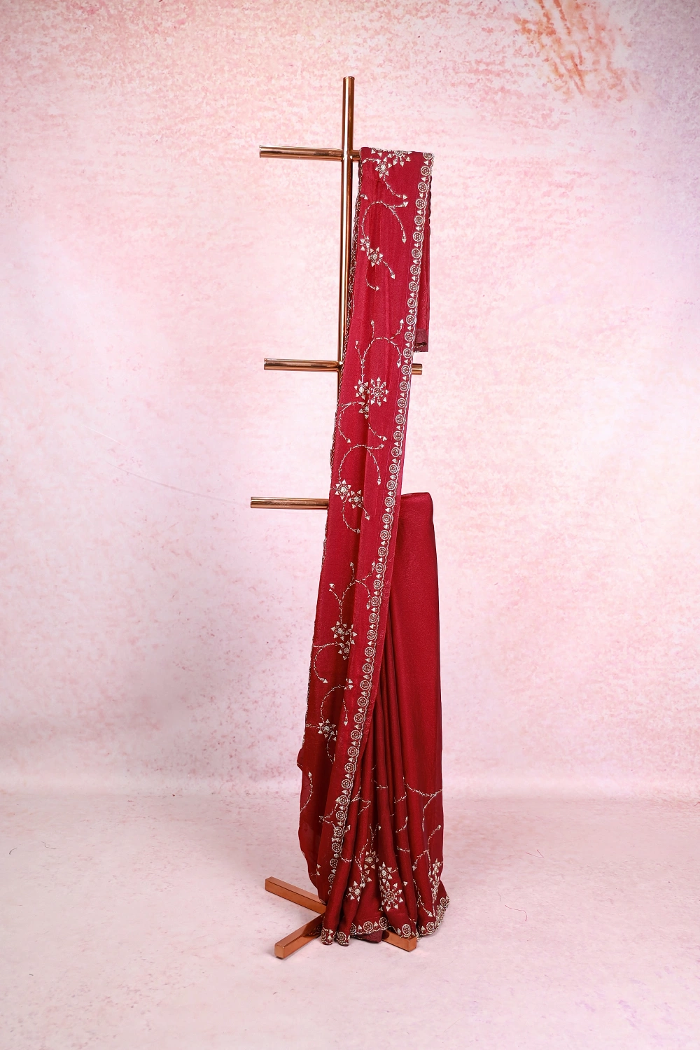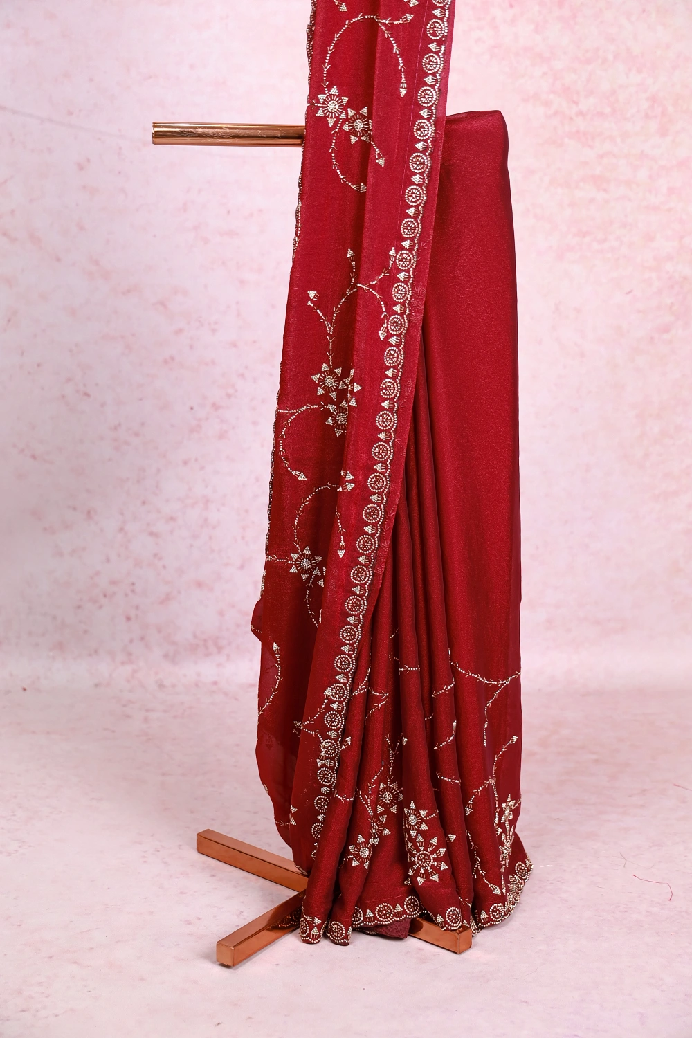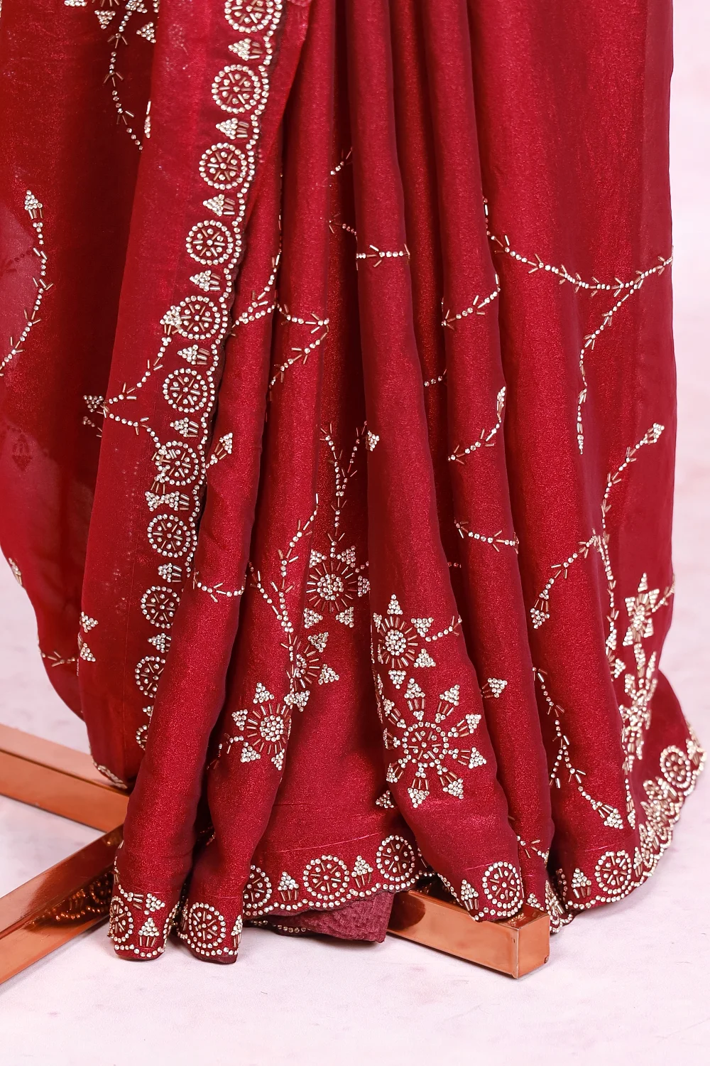 Wine Velvet Organza Stone Work Saree With Scalp Border. Includes Un Stitched Blouse