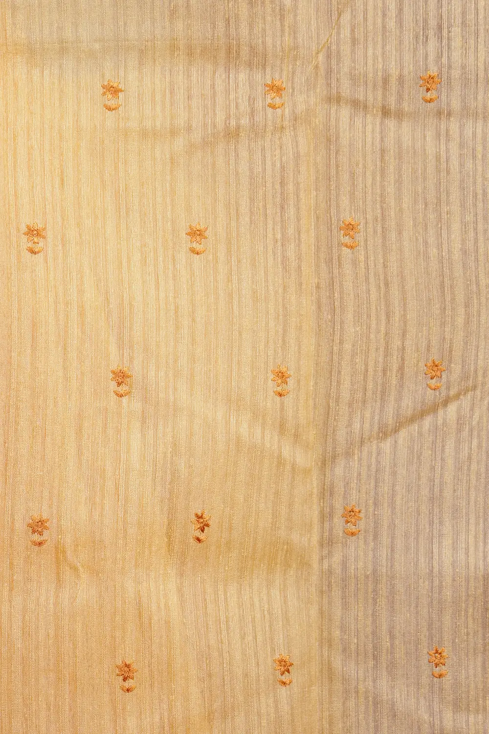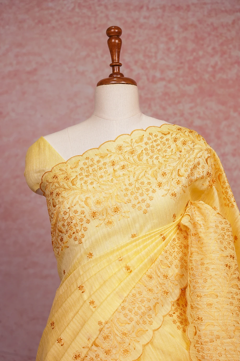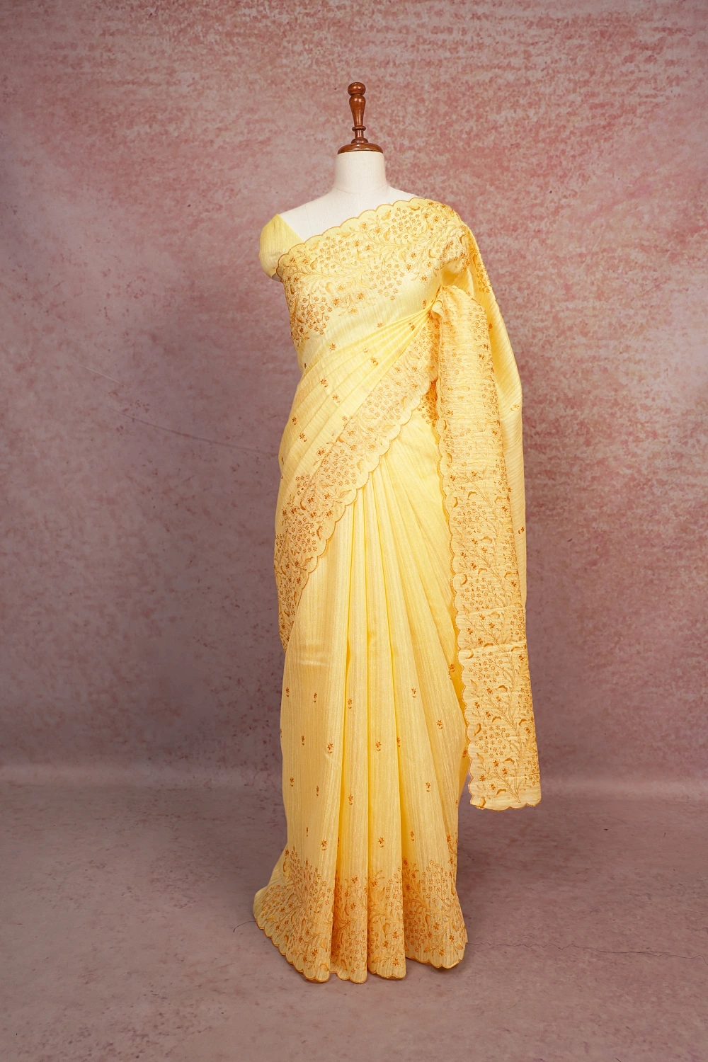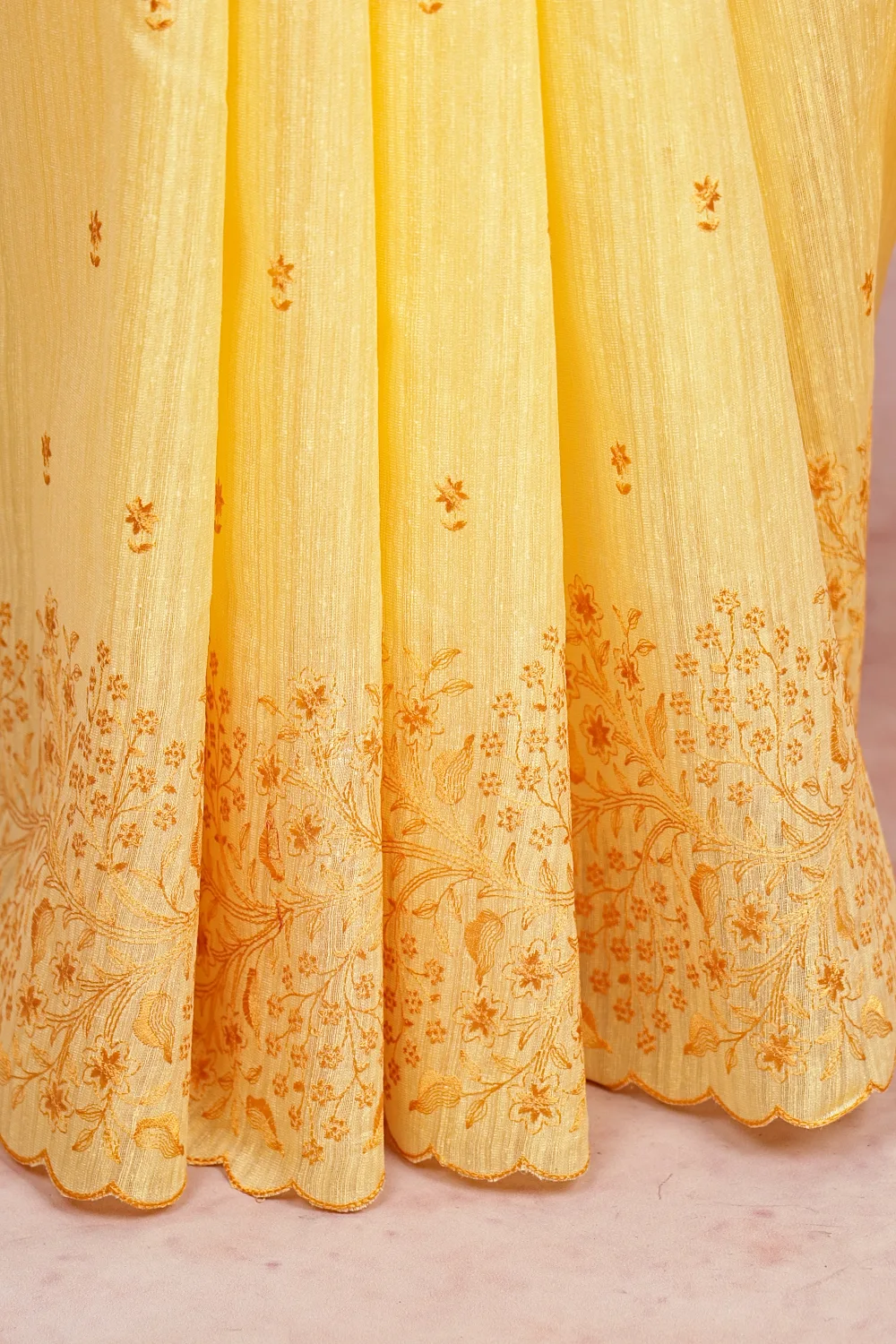 Yellow Semi Jute Floral Thread Saree With Scallop Border. Includes Unstitched Blouse