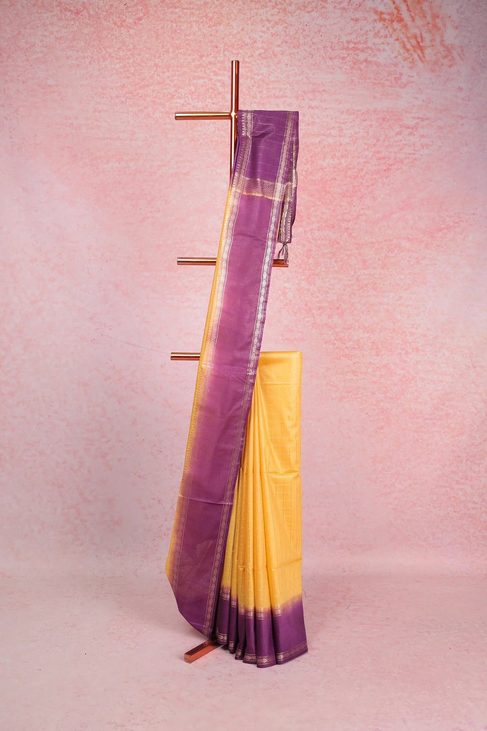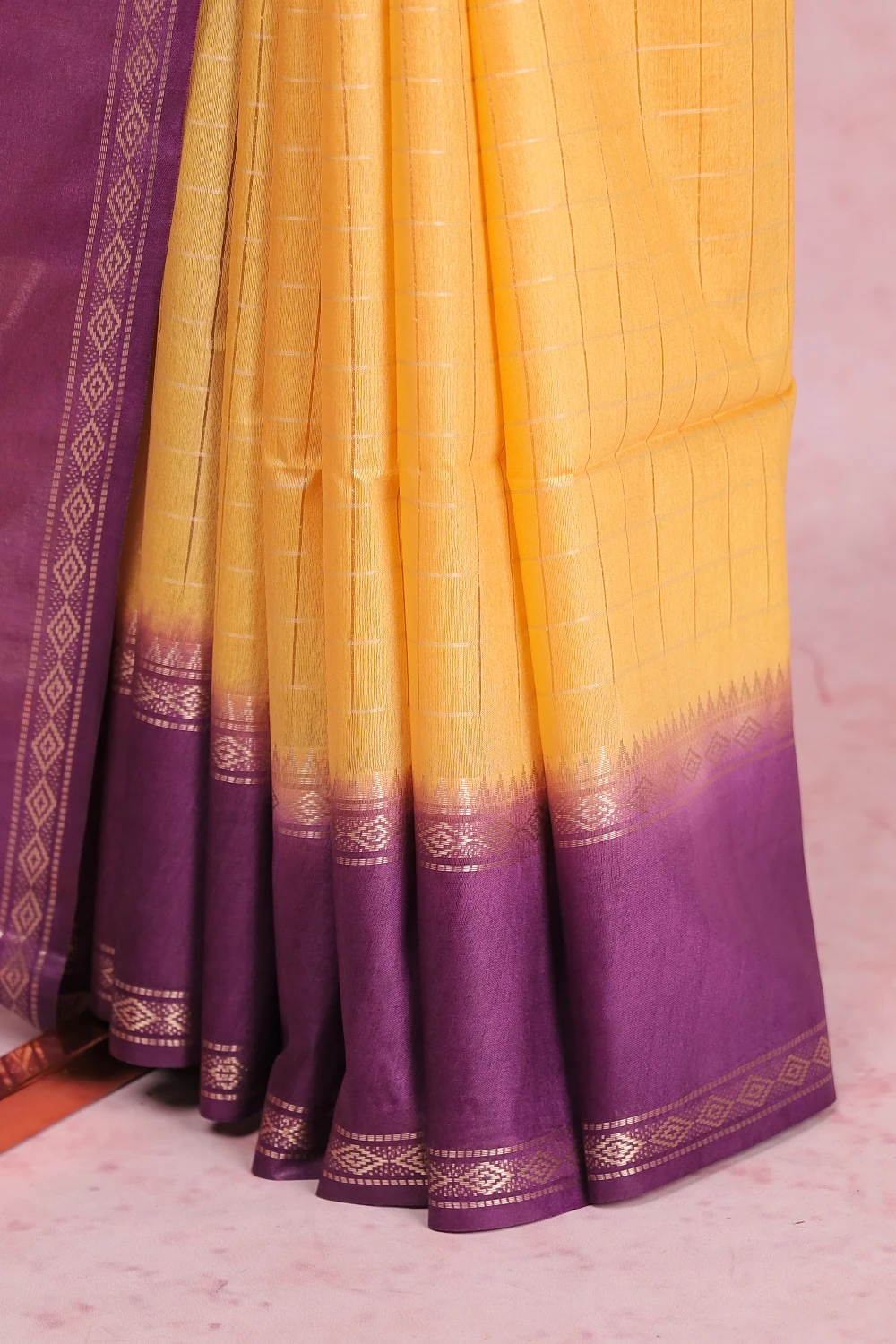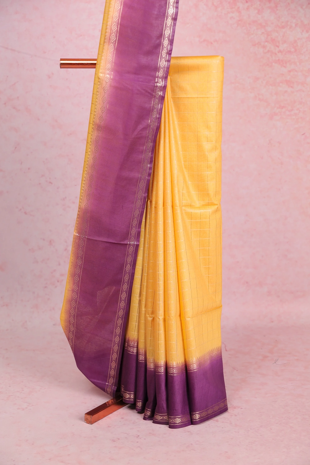 Yellow Semi Tussar Check Saree with Plain Border. Includes Unstitched Blouse