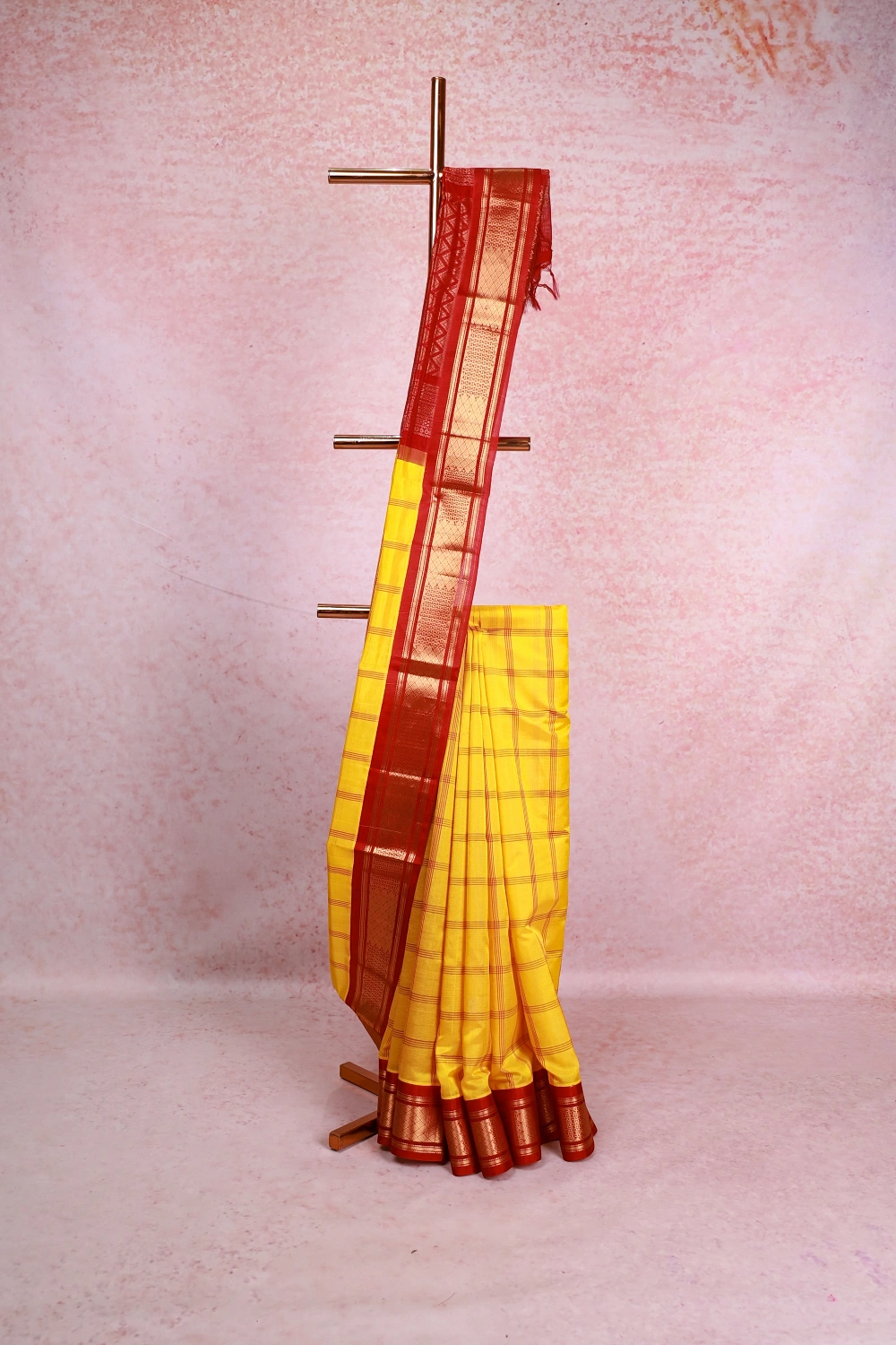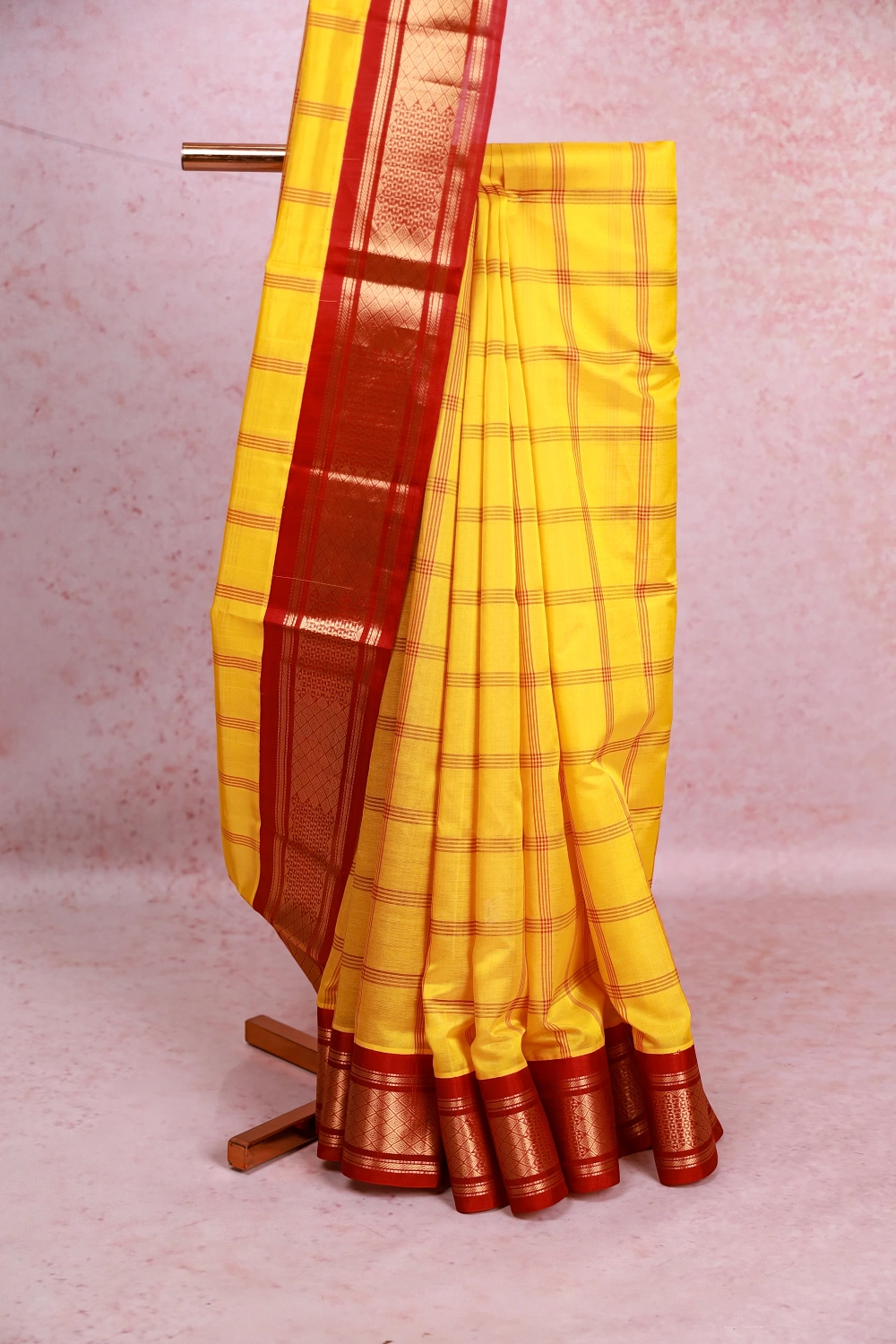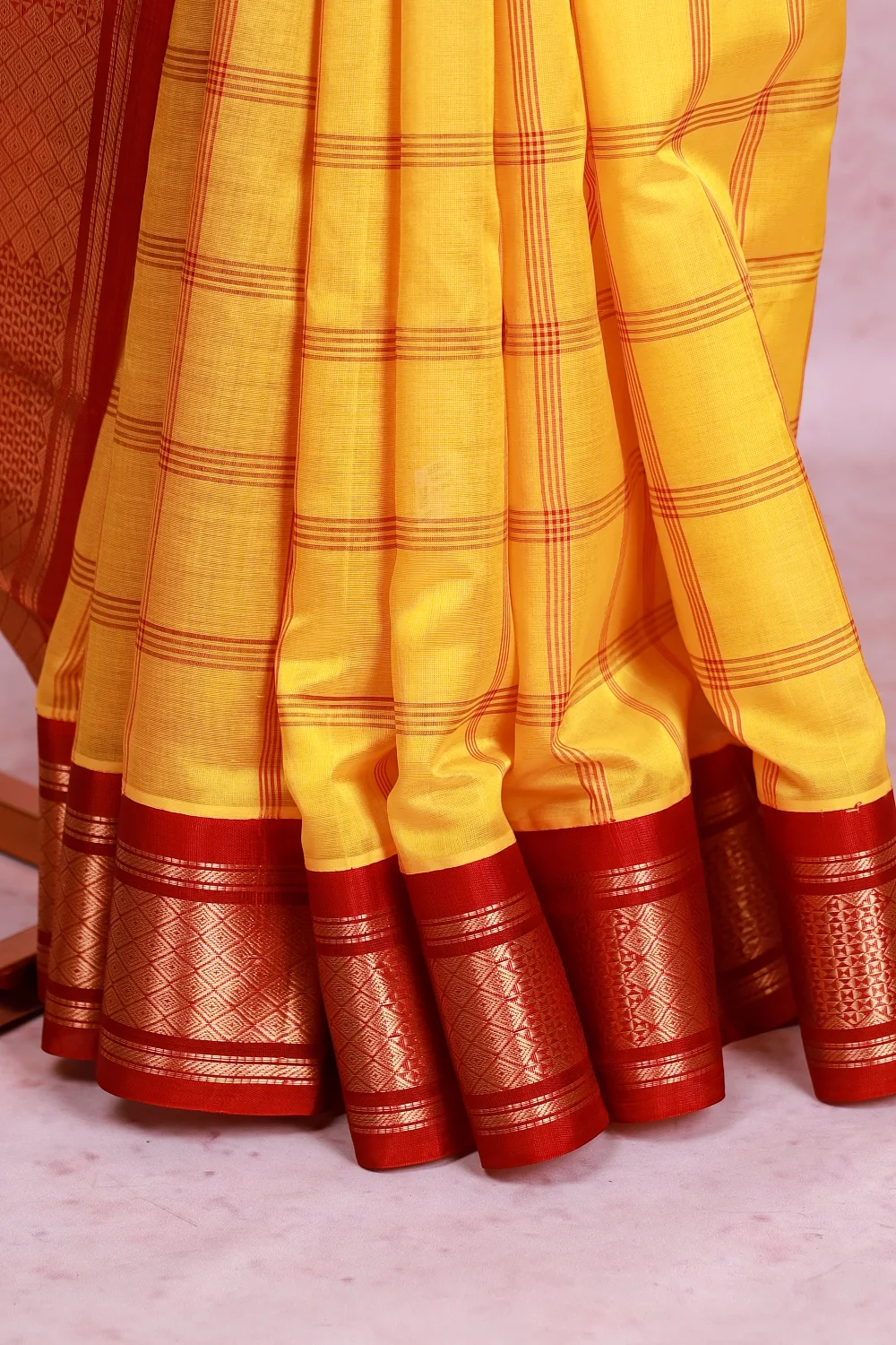 Yellow Silk Cotton Checks Saree With Zari Border. Includes Un Stitched Blouse