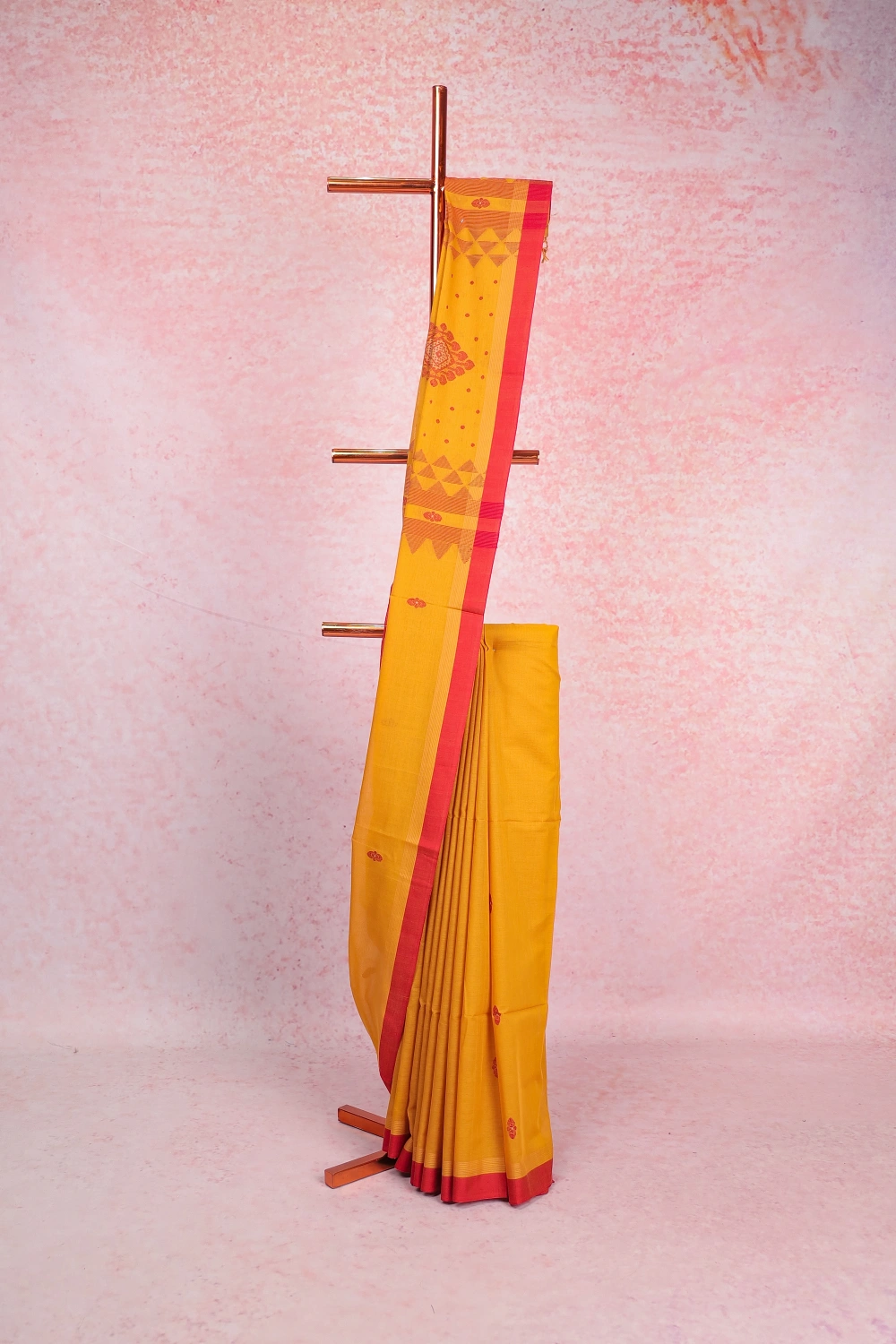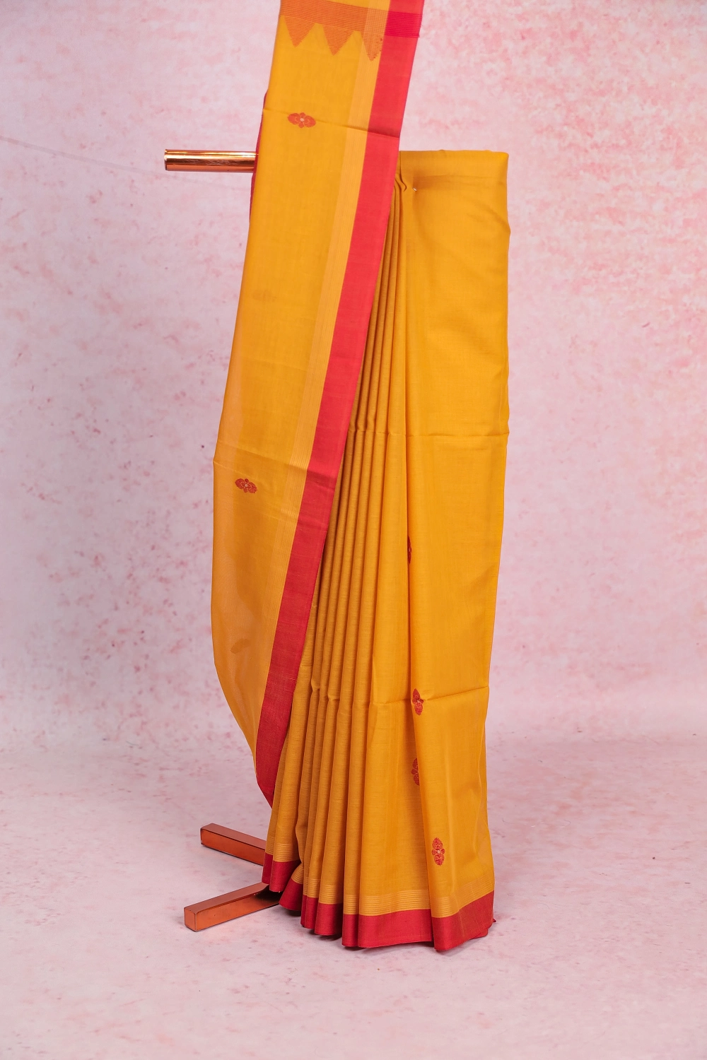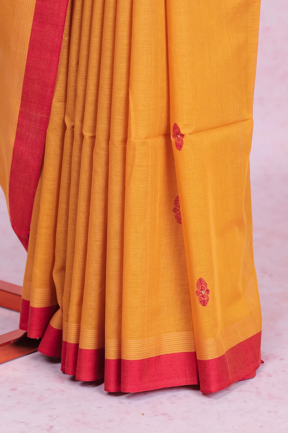 Yellow Soft Cotton Butta Saree with Plain Border. Includes Unstitched Blouse